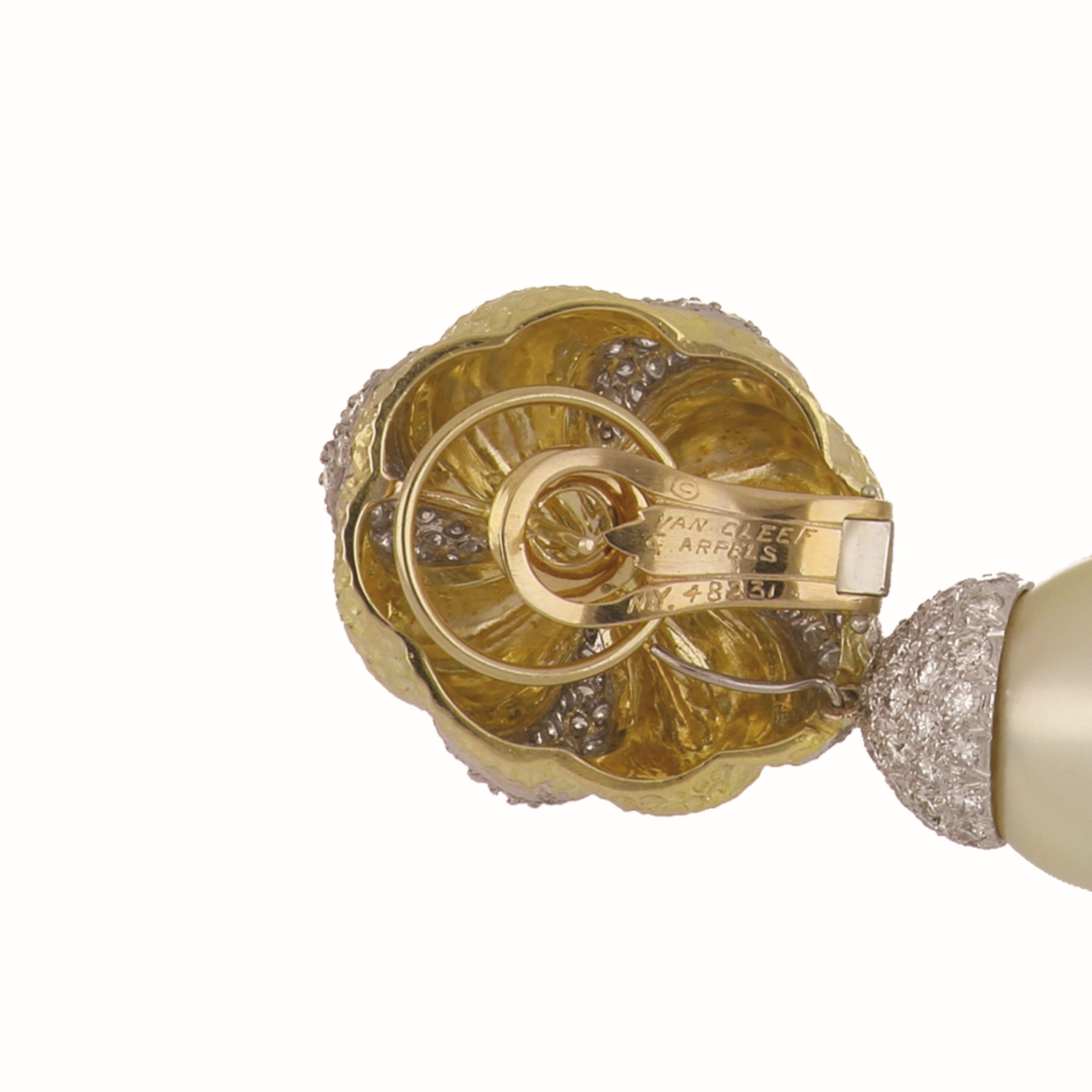A pair of vintage, Van Cleef & Arpels pave round brilliant-cut diamond and baroque South Sea pearl day/night earrings, set in platinum and 18K yellow gold. Circa 1970.