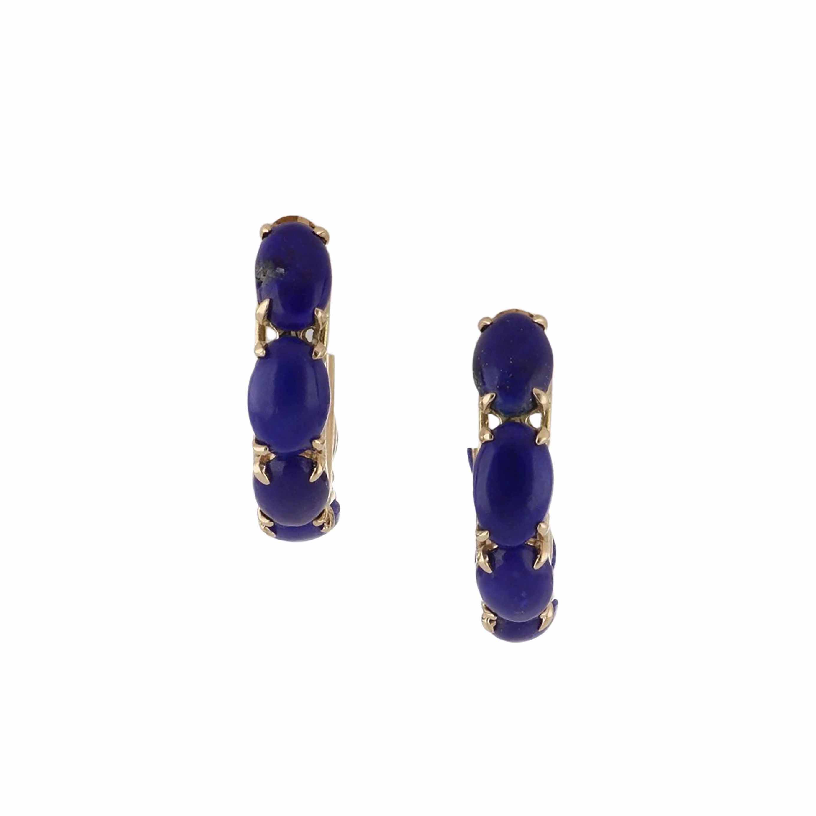 A pair of vintage oval cabochon lapis small hoop earrings, set in 14K yellow gold. Circa 1980