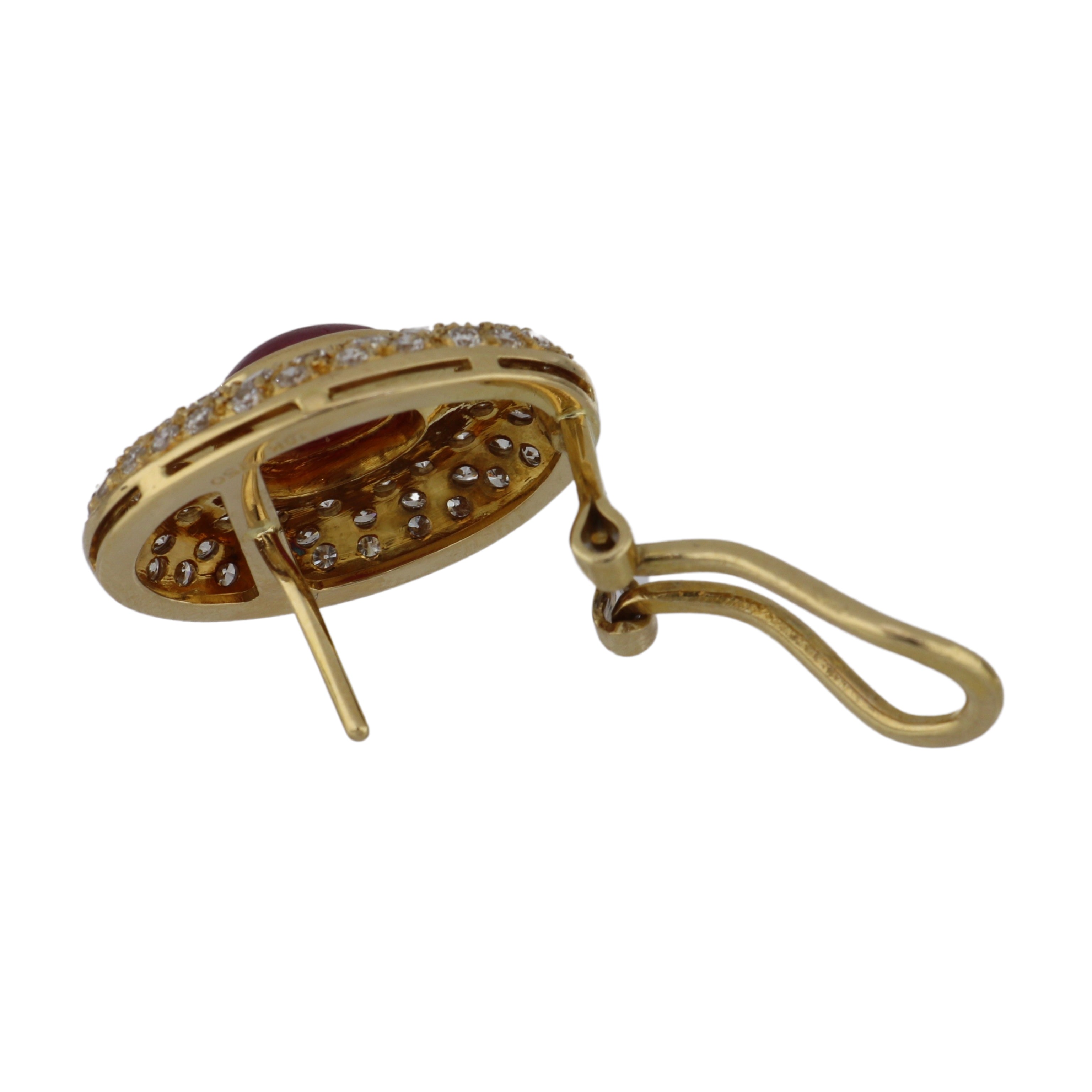 A pair of vintage cabochon ruby earrings with round brilliant cut diamond borders, set in 18K yellow gold. Circa 1980.