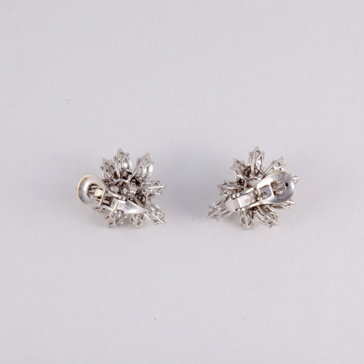 A pair of vintage diamond cluster earrings with central round brilliant-cut diamonds framed by pear and marquise brilliant-cut diamonds, set in platinum. Circa 1980.