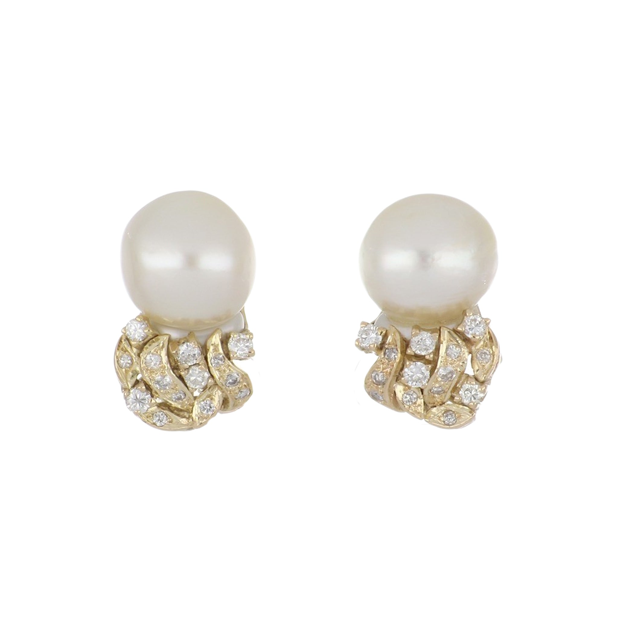 A pair of vintage 18K yellow gold South Sea pearl and diamond bouquet earrings. Circa 1990.