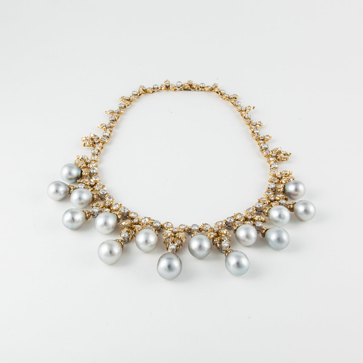 A vintage Buccellati fringe necklace with rose-cut and round brilliant-cut diamonds and cultured pearls in 18K yellow and white gold. Circa 1990s.