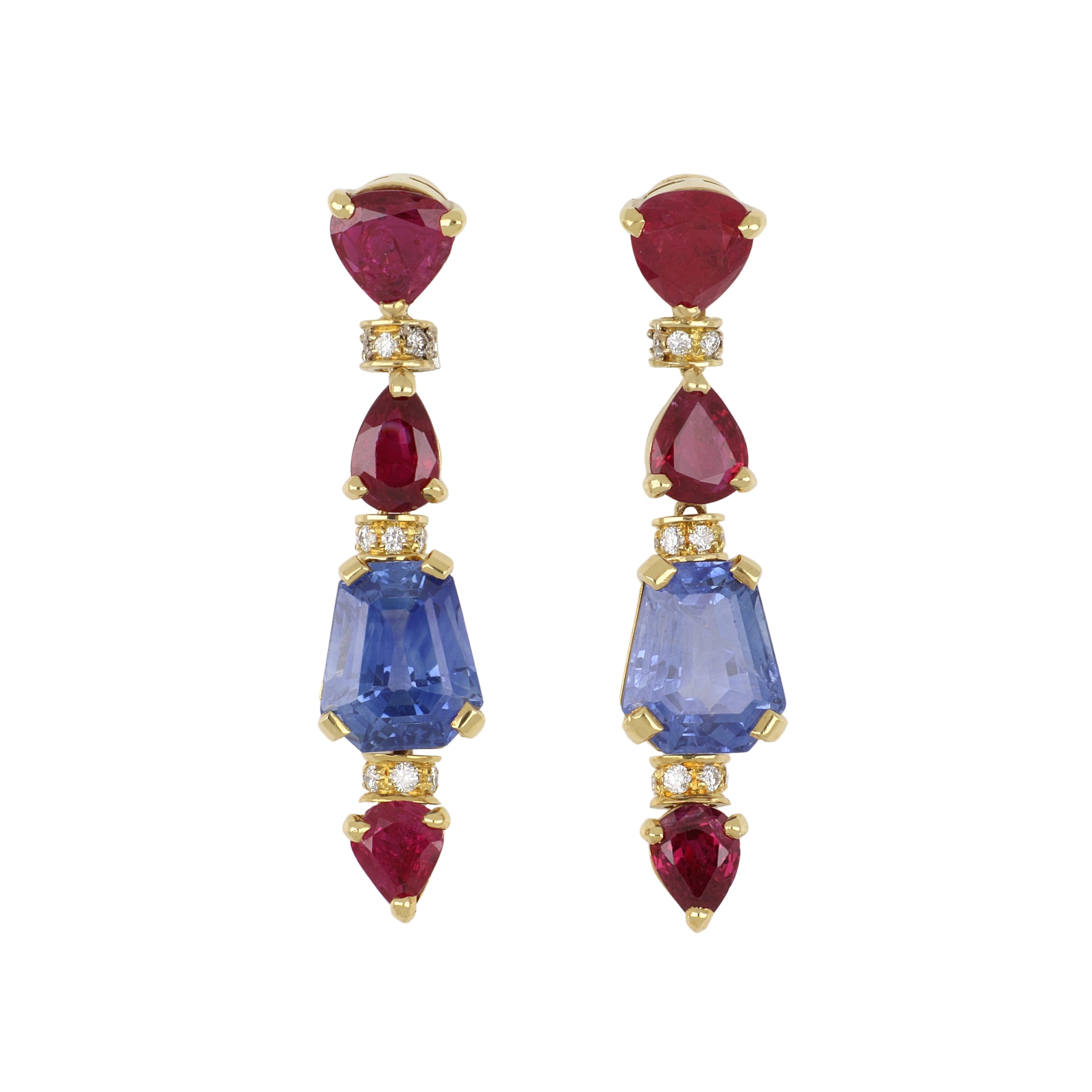 A pair of vintage Bulgari pear shape ruby and shield-cut sapphire earrings with diamonds set in 18K yellow gold. Circa 1980.