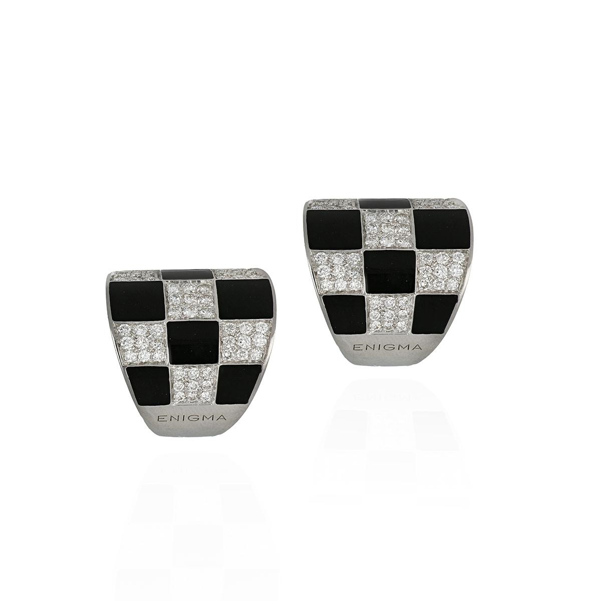 A pair of Bulgari 18K white gold black enamel & pavé diamond Enigma earrings. Circa 1990.