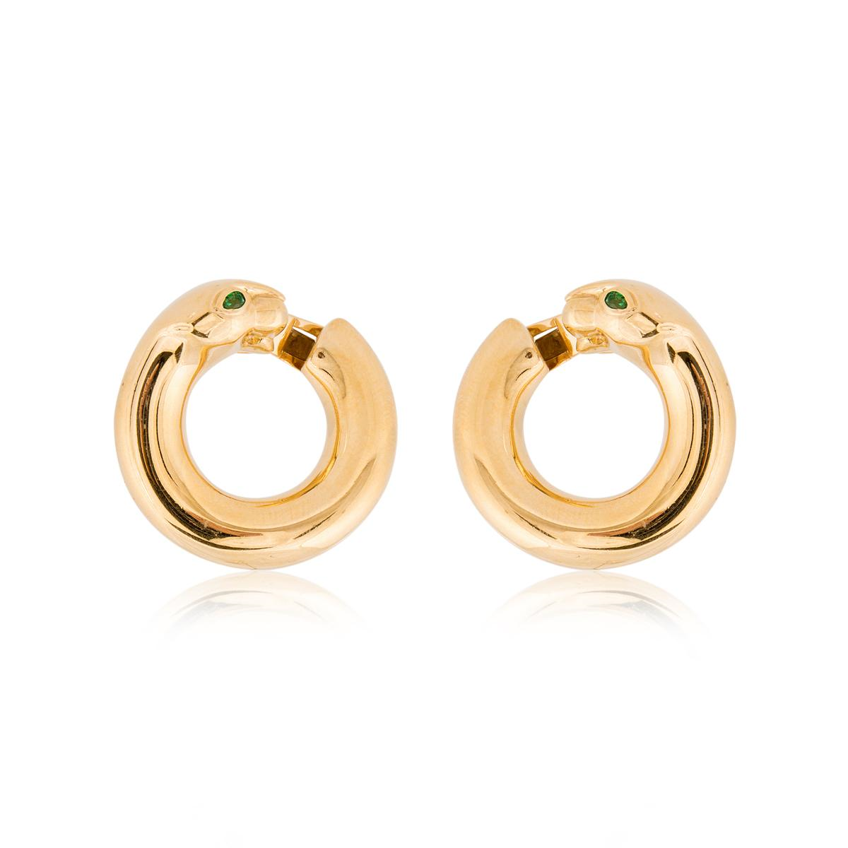 A pair of vintage Cartier panther earrings with pear-shape emerald eyes, set in 18K yellow gold.