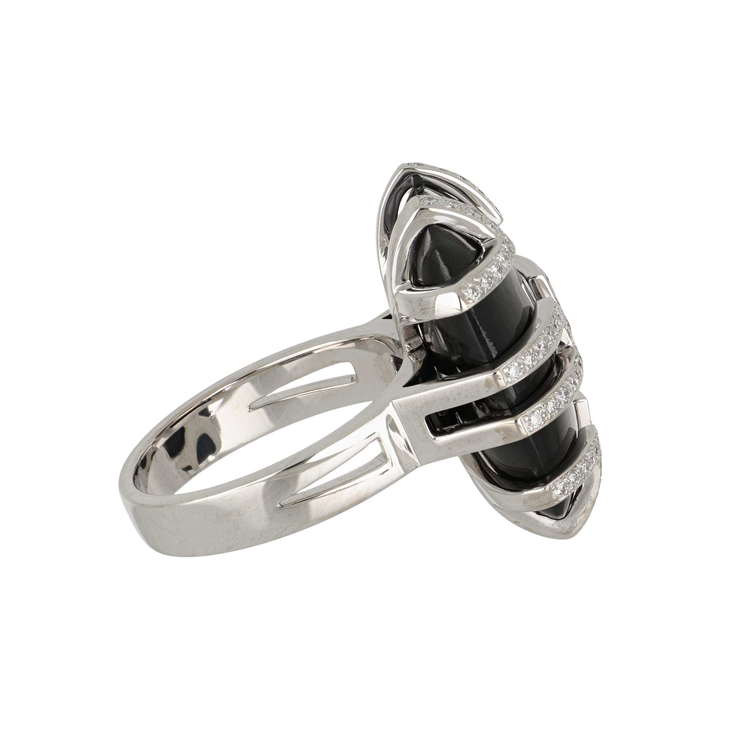 A vintage Cartier "La Baiser Du Dragon" black jadeite ring with round brilliant-cut diamonds, set in 18K white gold. Circa 1990. Signed: Cartier.