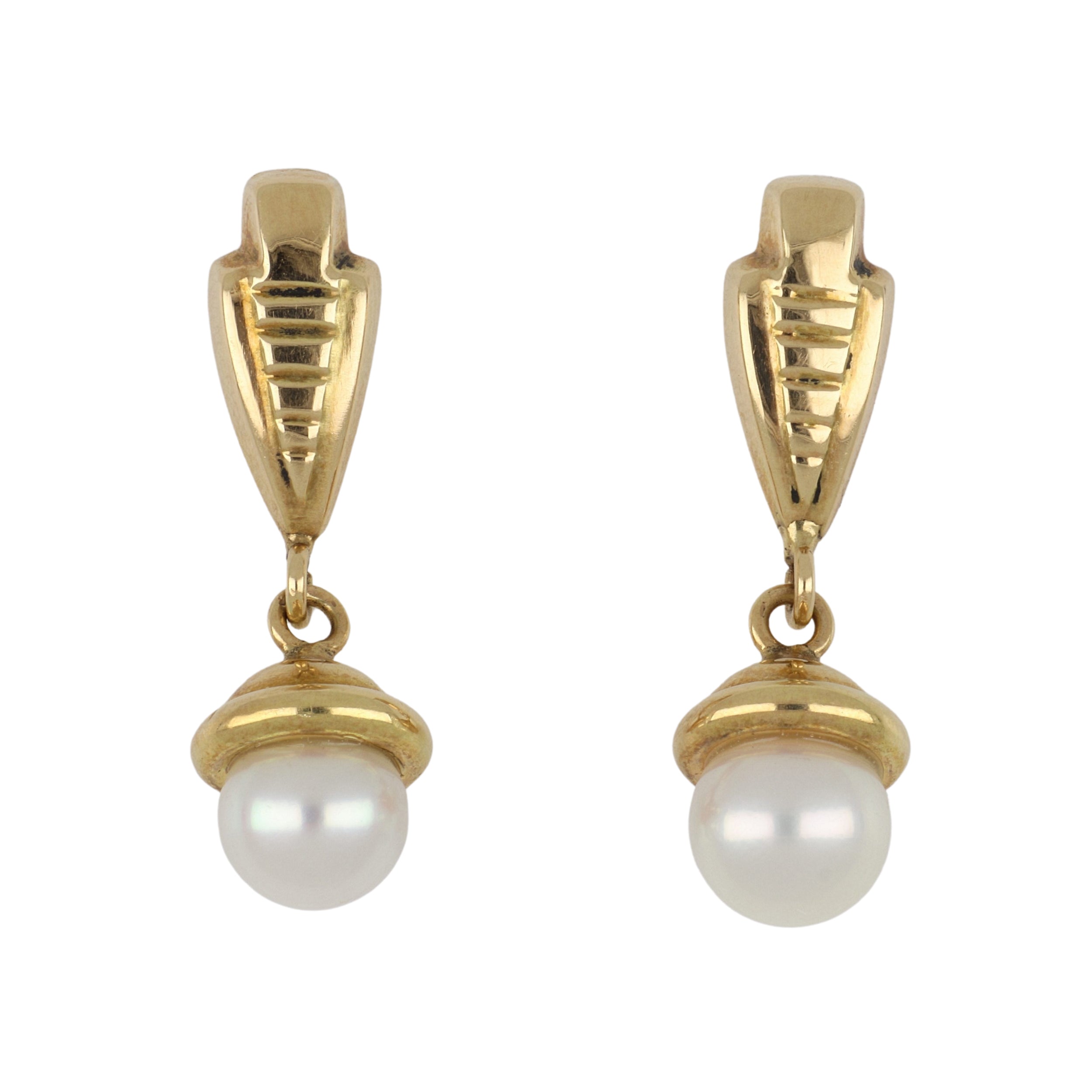 A vintage Castellani Art Deco inspired cultured pearl drop earrings, set in 15K yellow gold. Circa 1990.