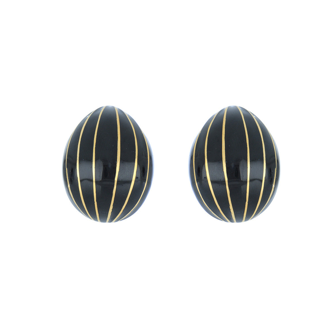 A pair of vintage David Webb "Manhattan Minimalism Collection" 18k yellow gold & black enamel domed tear drop earrings. Circa 1980.