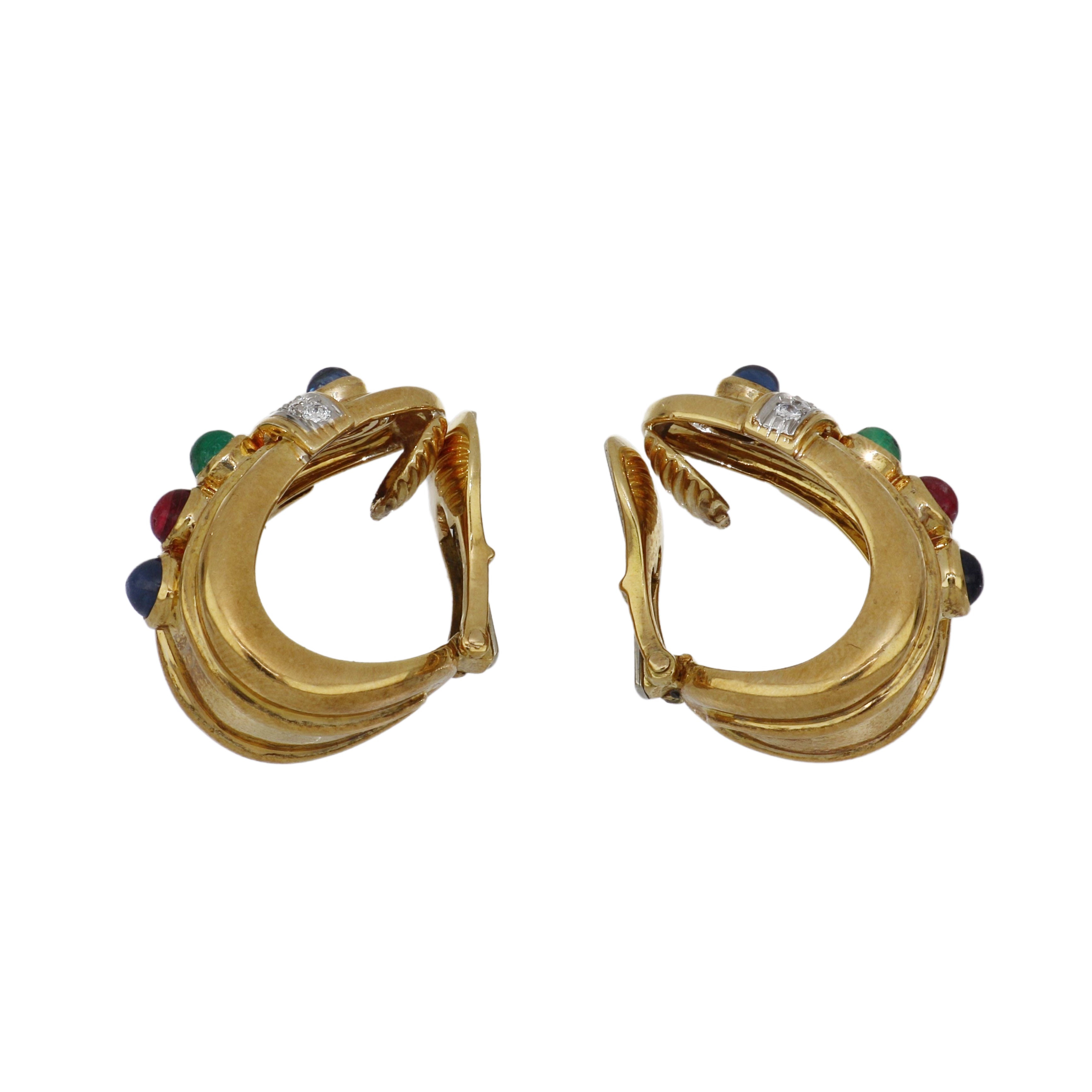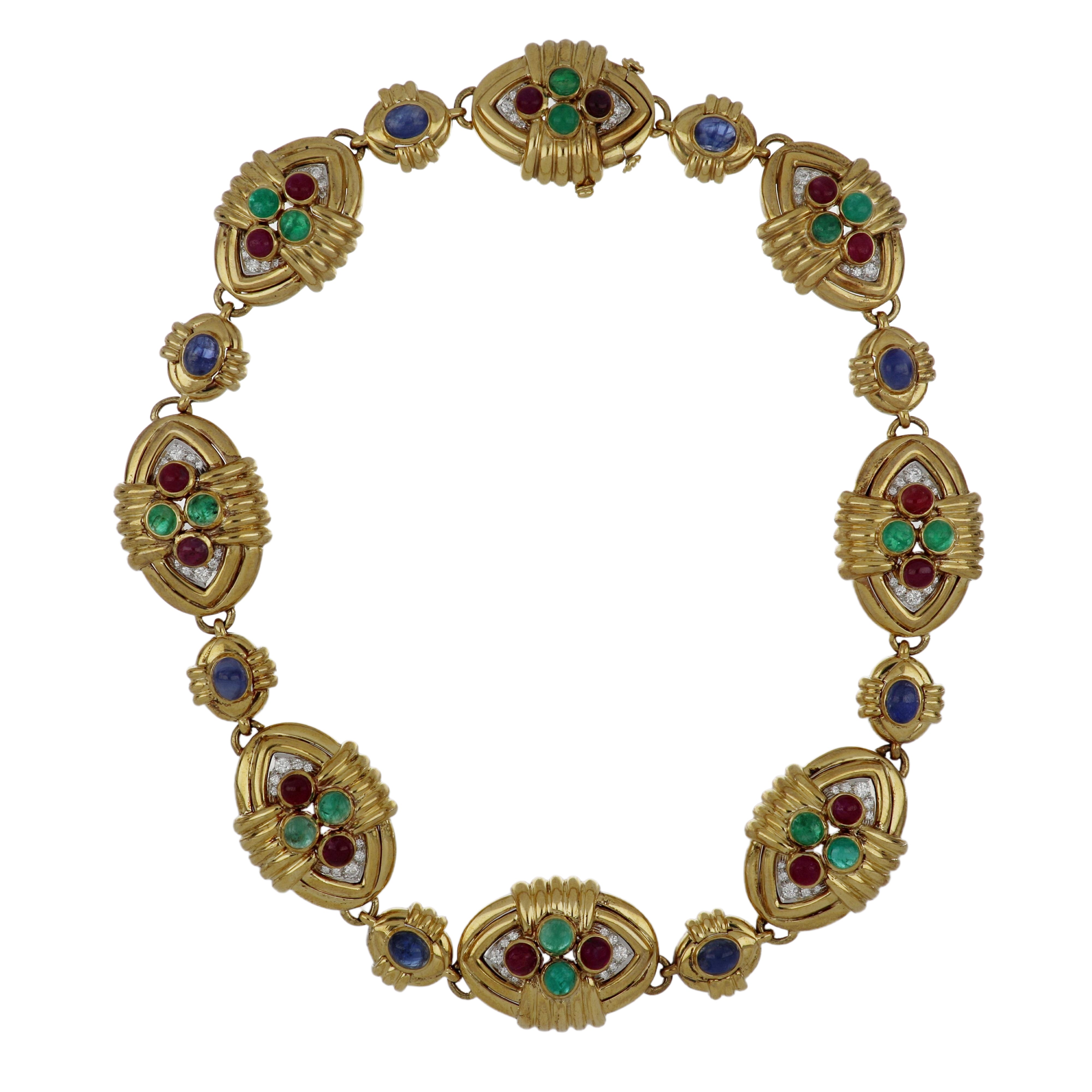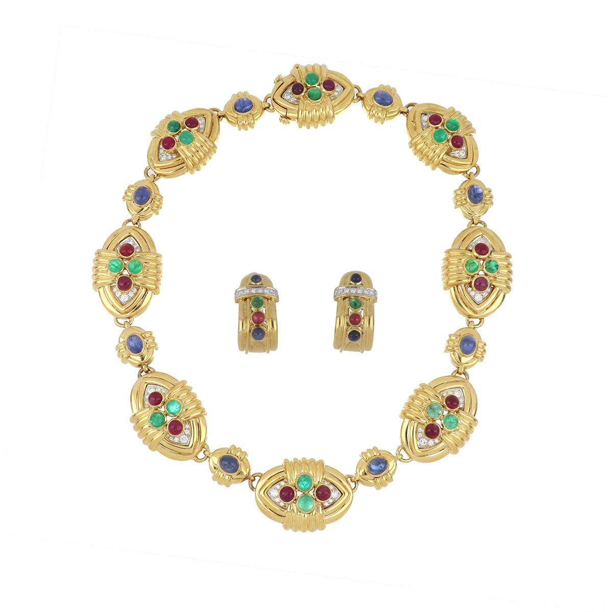 A vintage David Webb 'Colors' Collection multi gemstone necklace and earrings with diamonds in 18K yellow gold and platinum. Circa 1980.