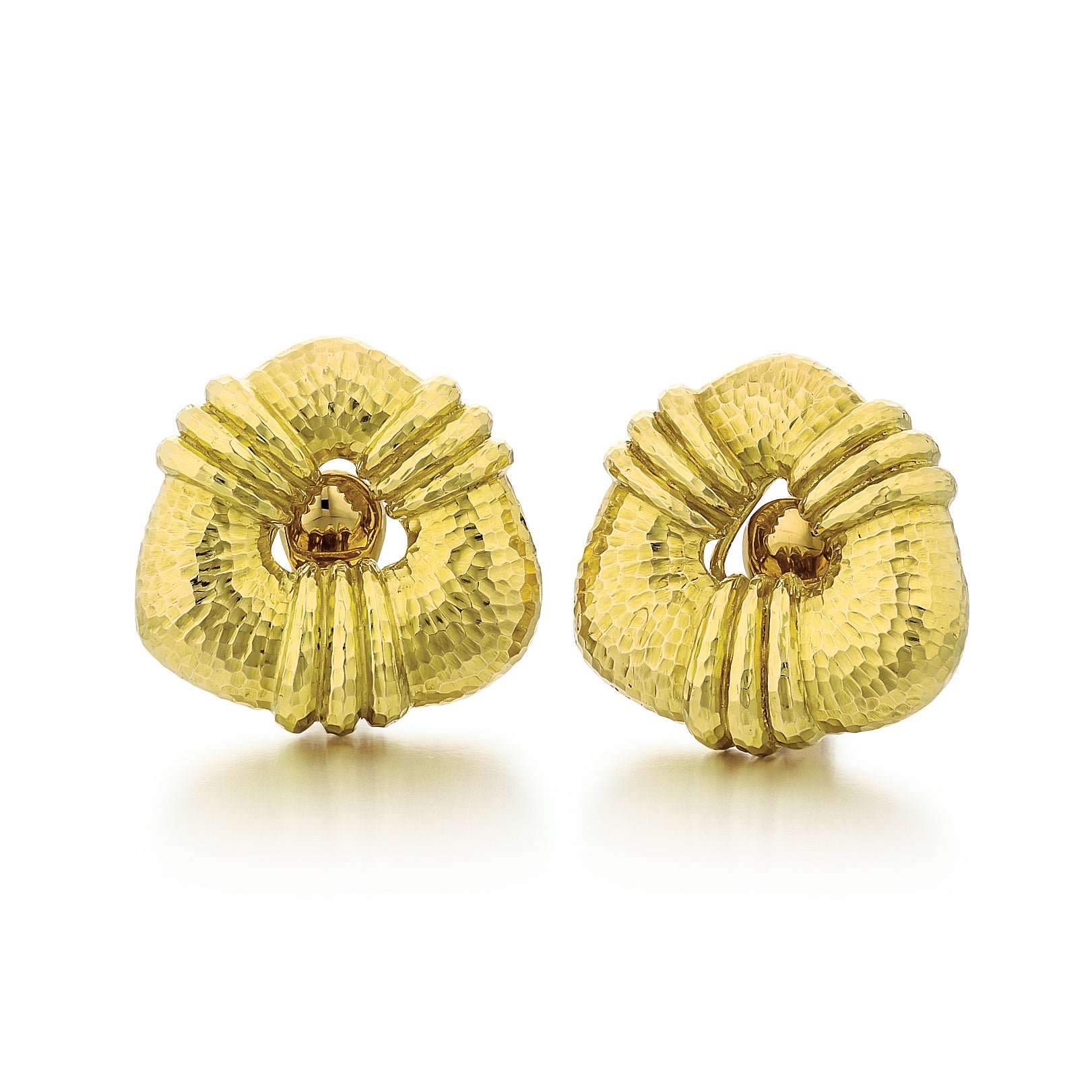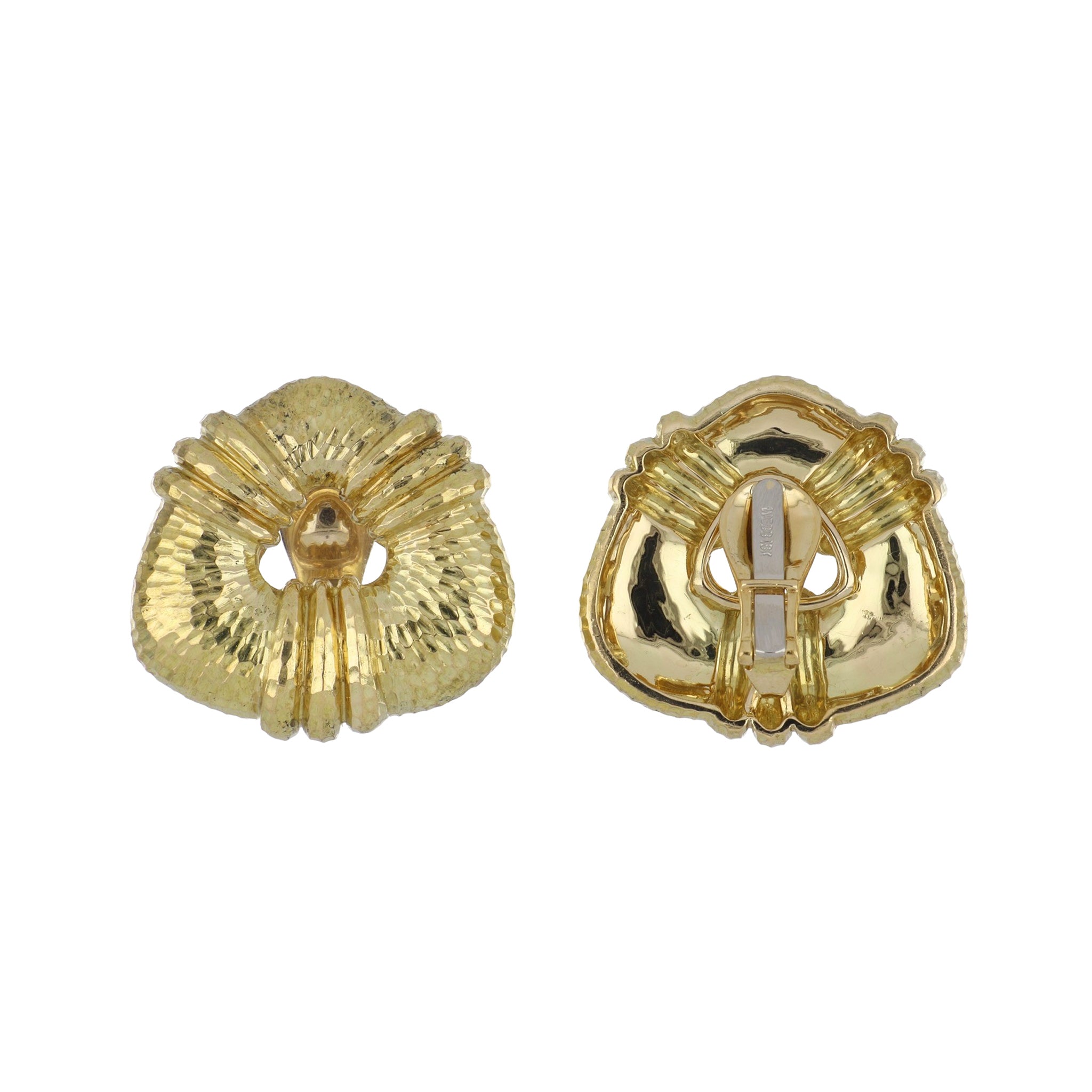 A pair of vintage David Webb 18K yellow gold hammered triangular Clinch Earrings from the 57th Street Collection. Circa 1990.