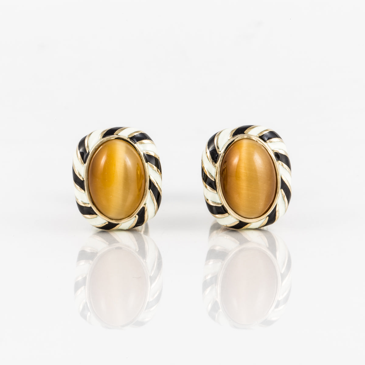 A pair of vintage David Webb tiger's eye quartz and black and white enamel cufflinks, in 18K yellow gold. Circa 1990.