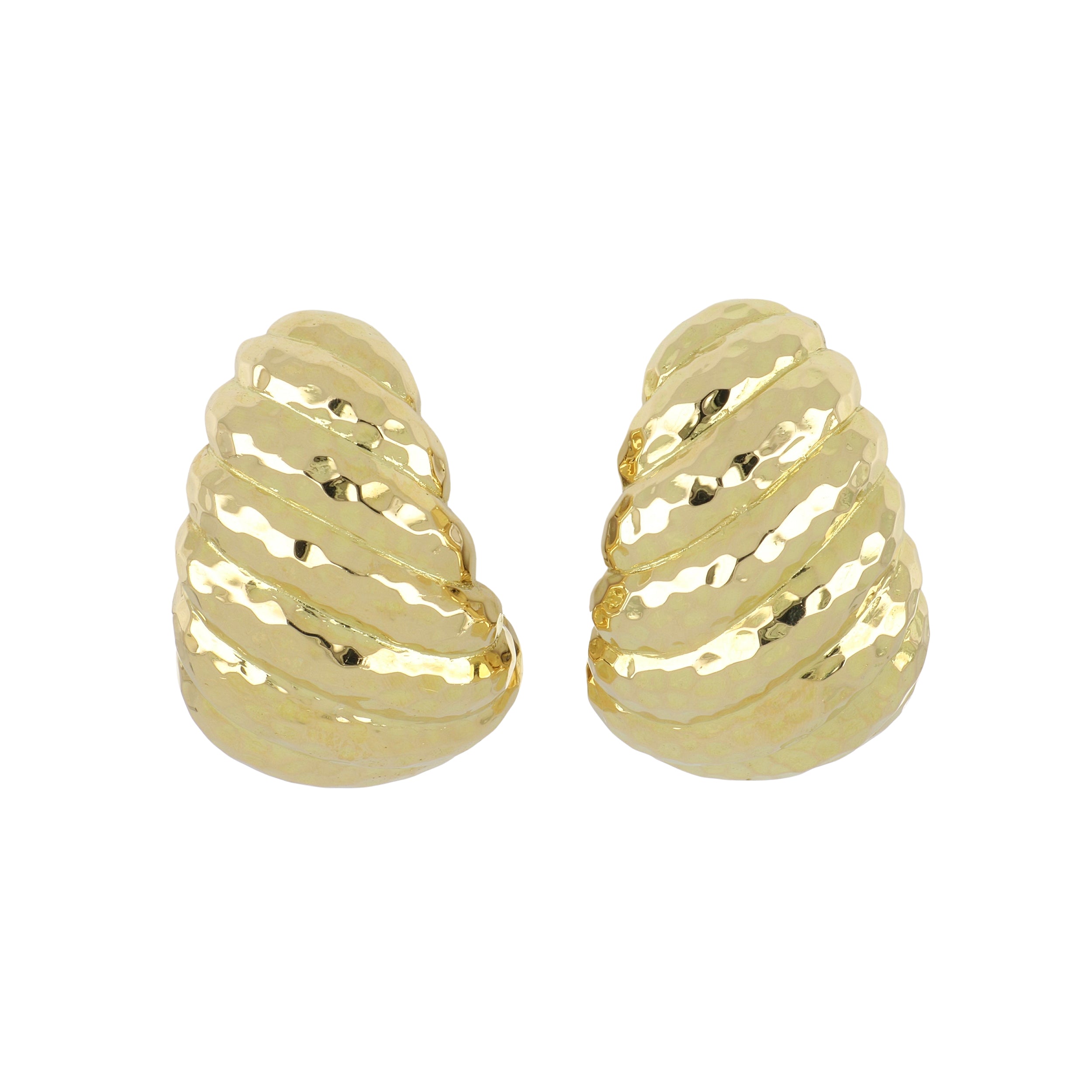 A pair of vintage David Webb ribbed clip earrings with a hammered finish, set in 18K yellow gold. Circa 1990.
