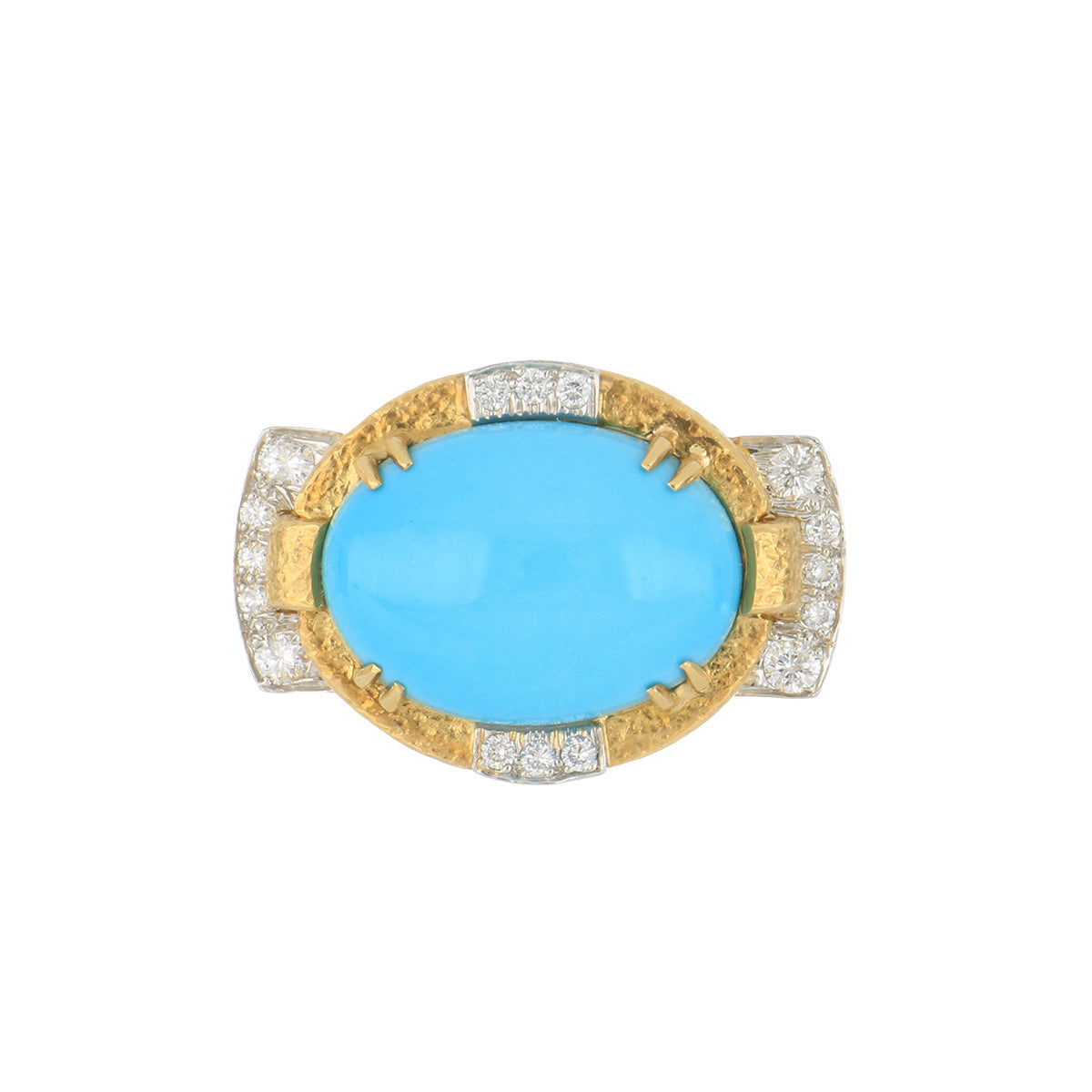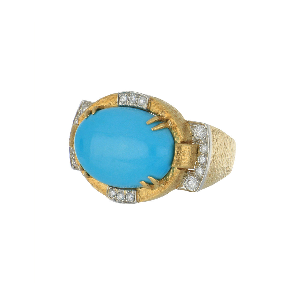 A vintage David Webb oval turquoise ring with diamond accents, set in 18K yellow gold and platinum. From the Colors Collection. Circa 1980.