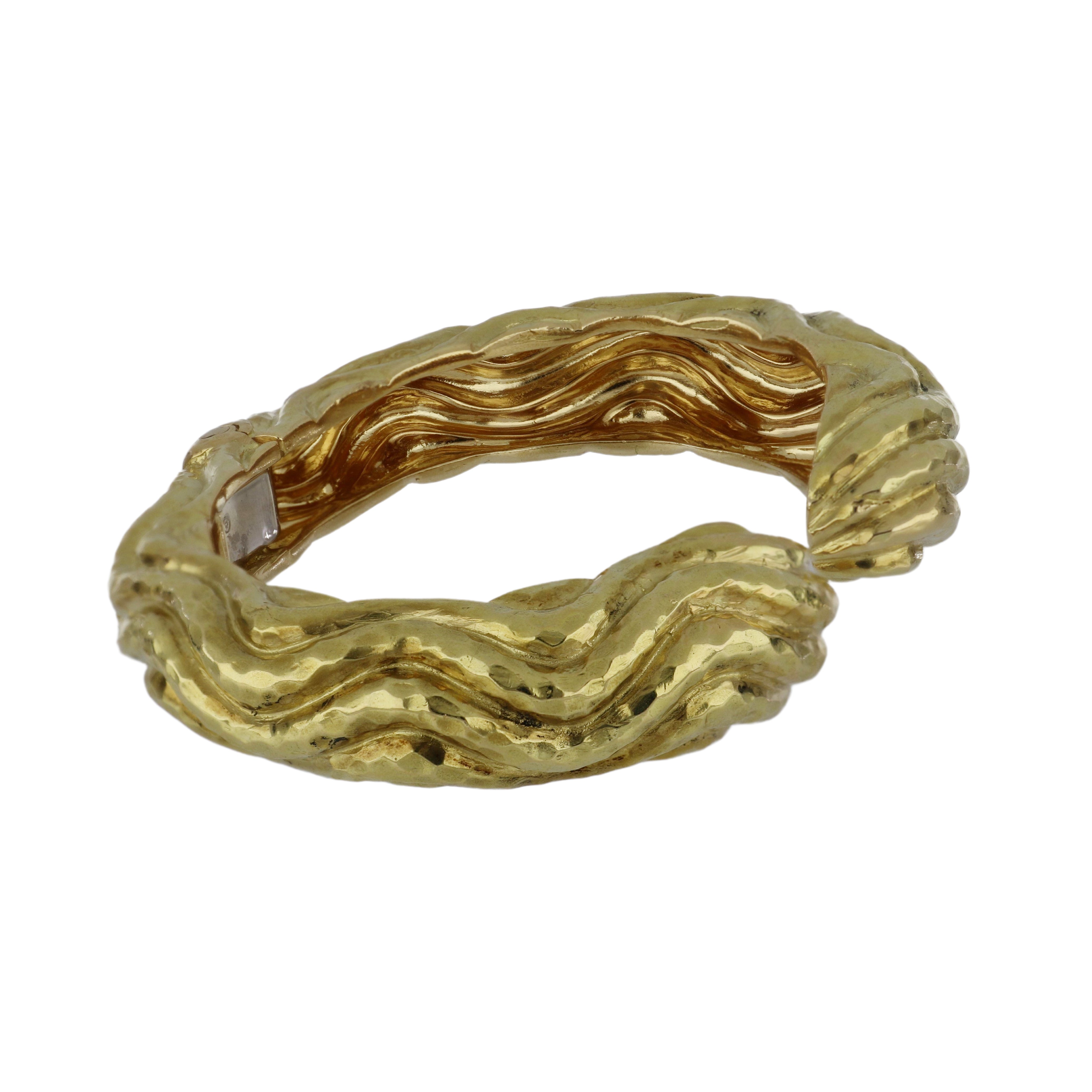 A vintage David Webb hammered hinged "Wave Bangle" cuff bracelet, set in 18K yellow gold. Circa 1990.