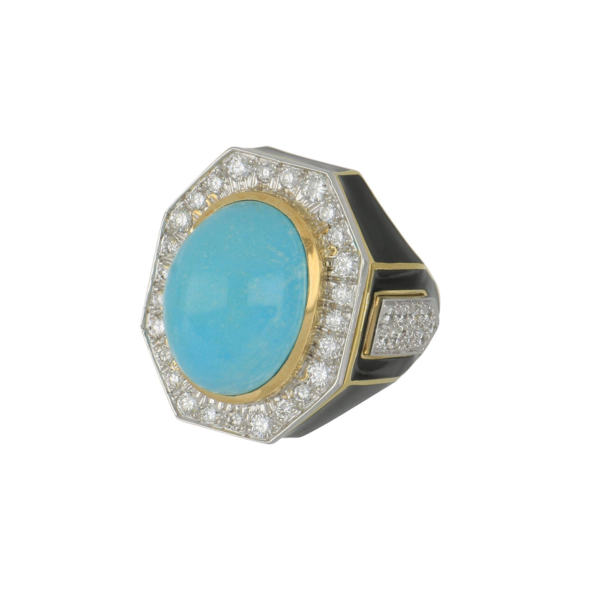 A vintage David Webb turquoise ring with black enamel and round diamonds from the Manhattan Minimalism Collection, crafted in platinum and 18k yellow gold. Circa 1990.