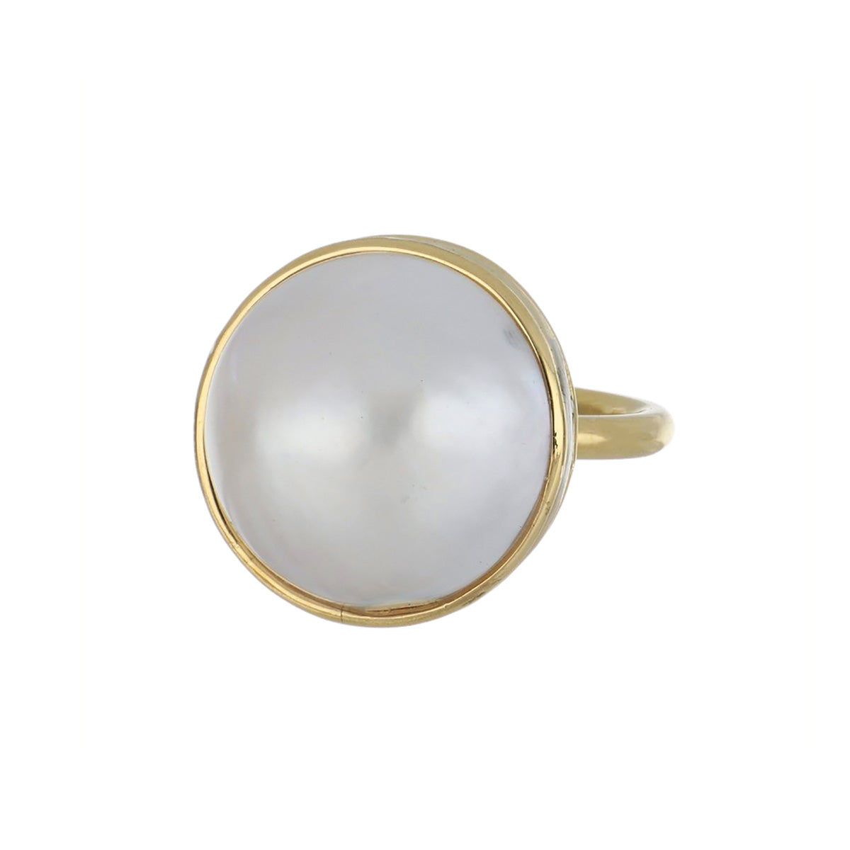 An estate bezel-set mabé pearl ring, set in 18K yellow gold. Circa 1990s.