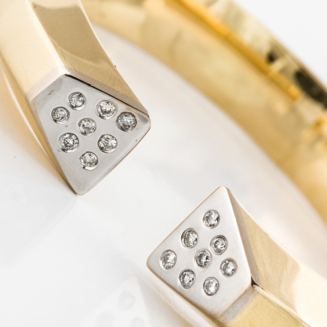 An estate modern, round brilliant-cut diamond bangle set in 18k yellow gold. Italy, Circa 2000.