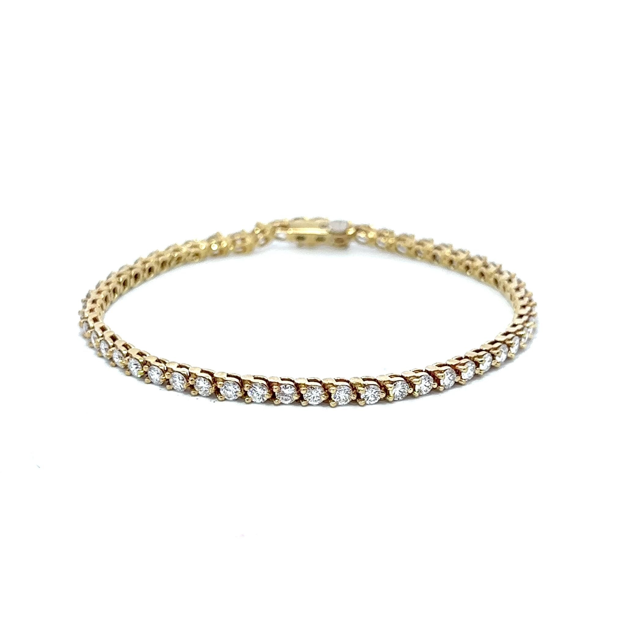 A vintage three prong diamond line bracelet, set in 18K yellow gold. Signed JPE. Circa 1980.