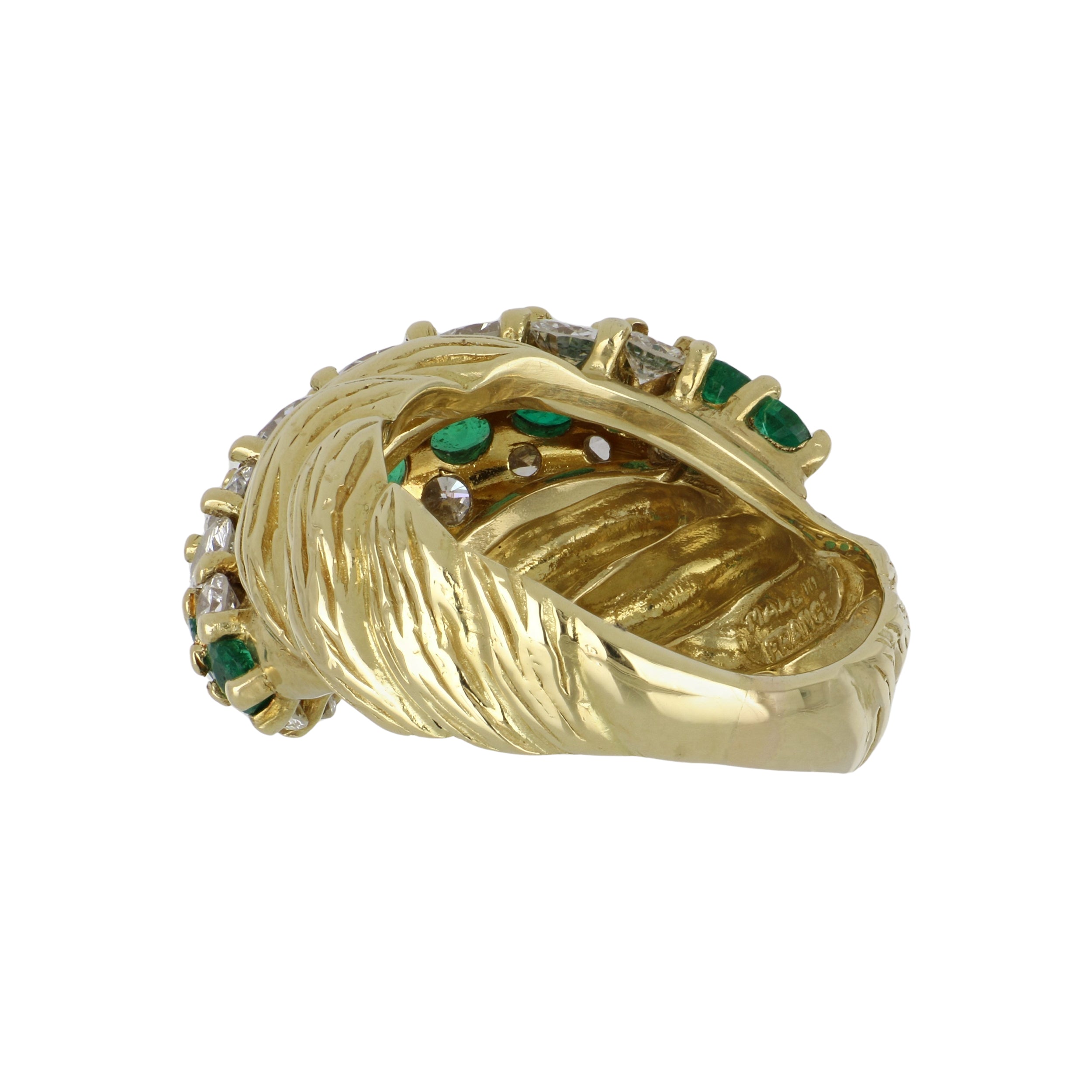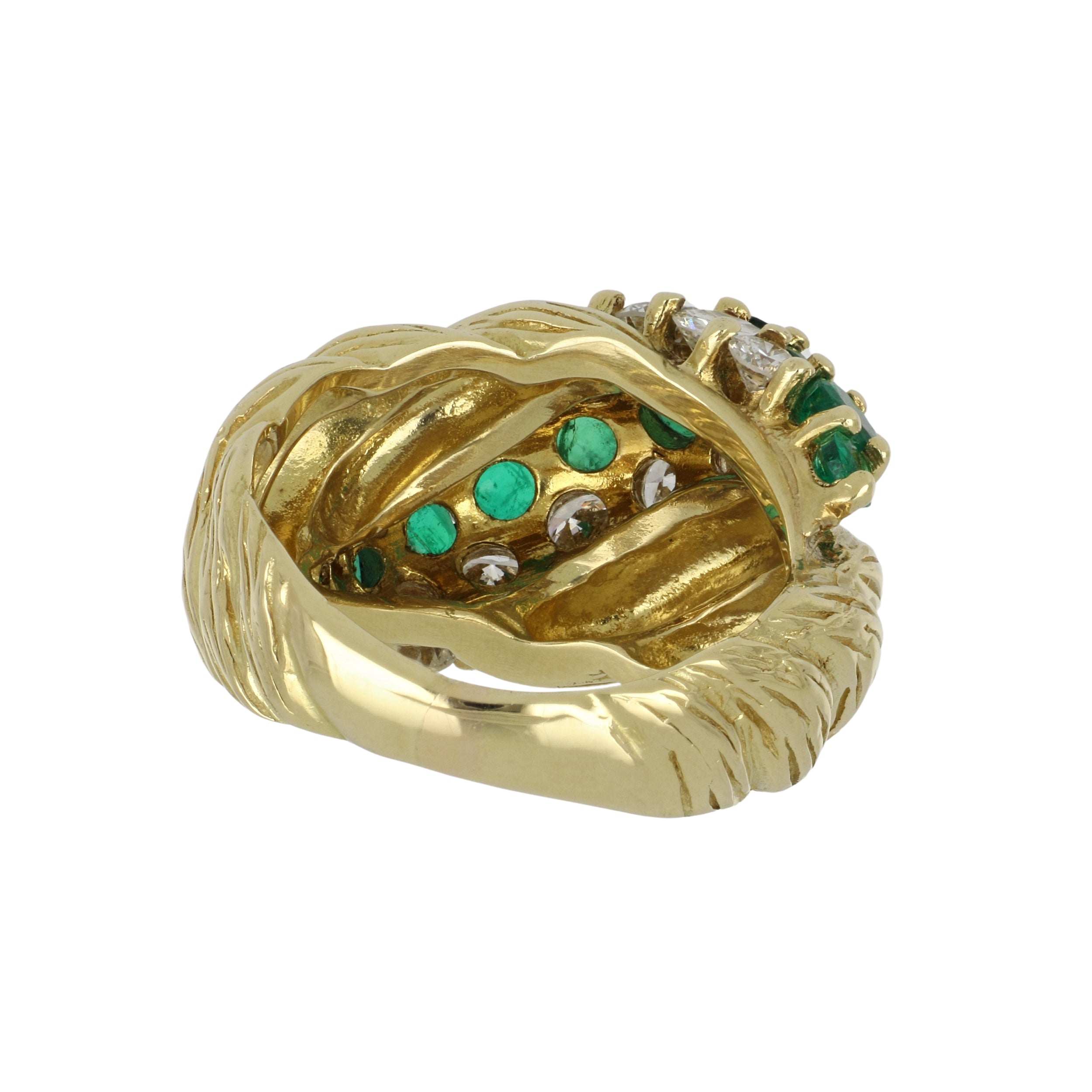 A vintage 18k yellow gold domed emerald and diamond cable ring. France; circa 1980.
