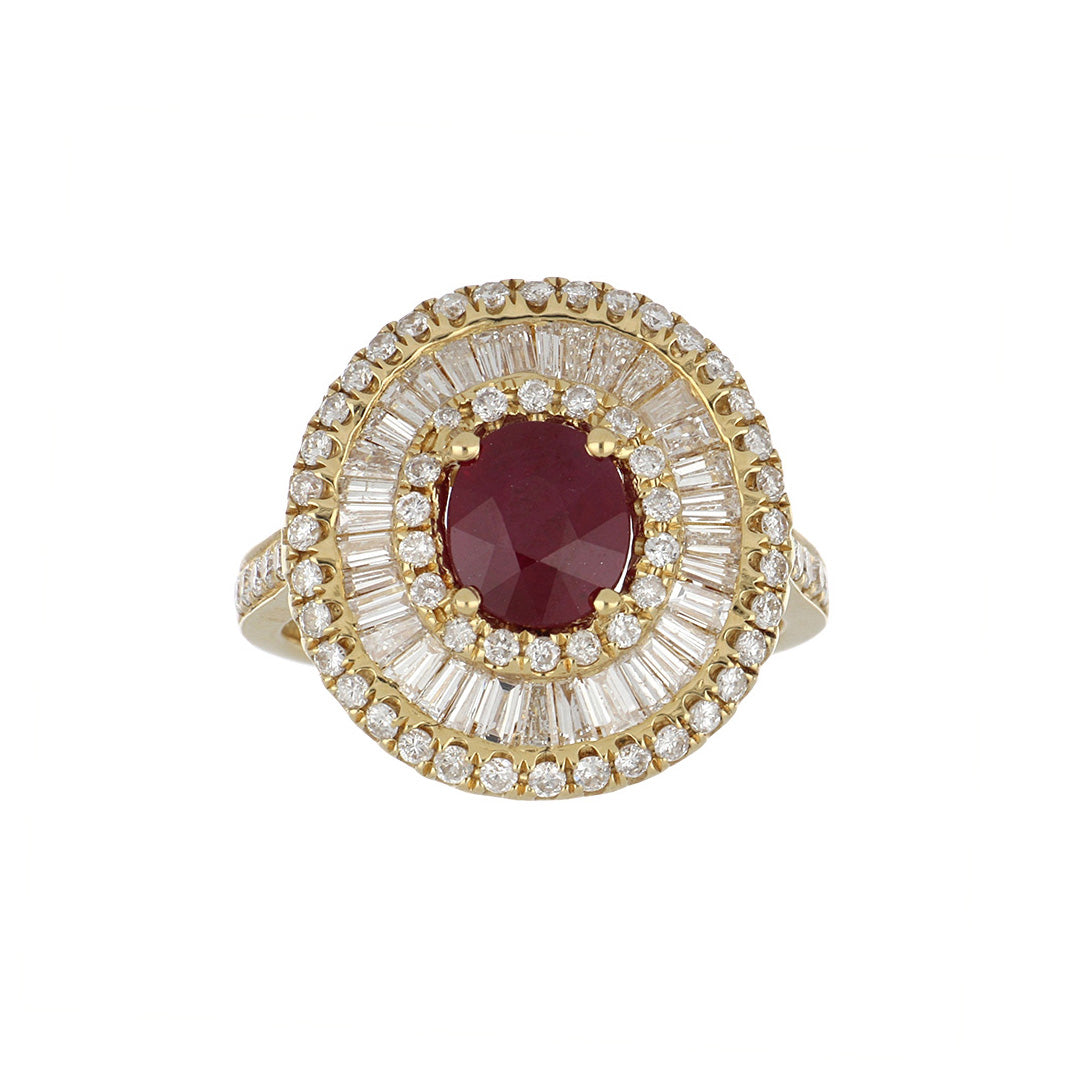 An estate target ring centered with a oval shape ruby, accented by baguette and round brilliant-cut diamonds in 18k yellow gold. Circa 2000.