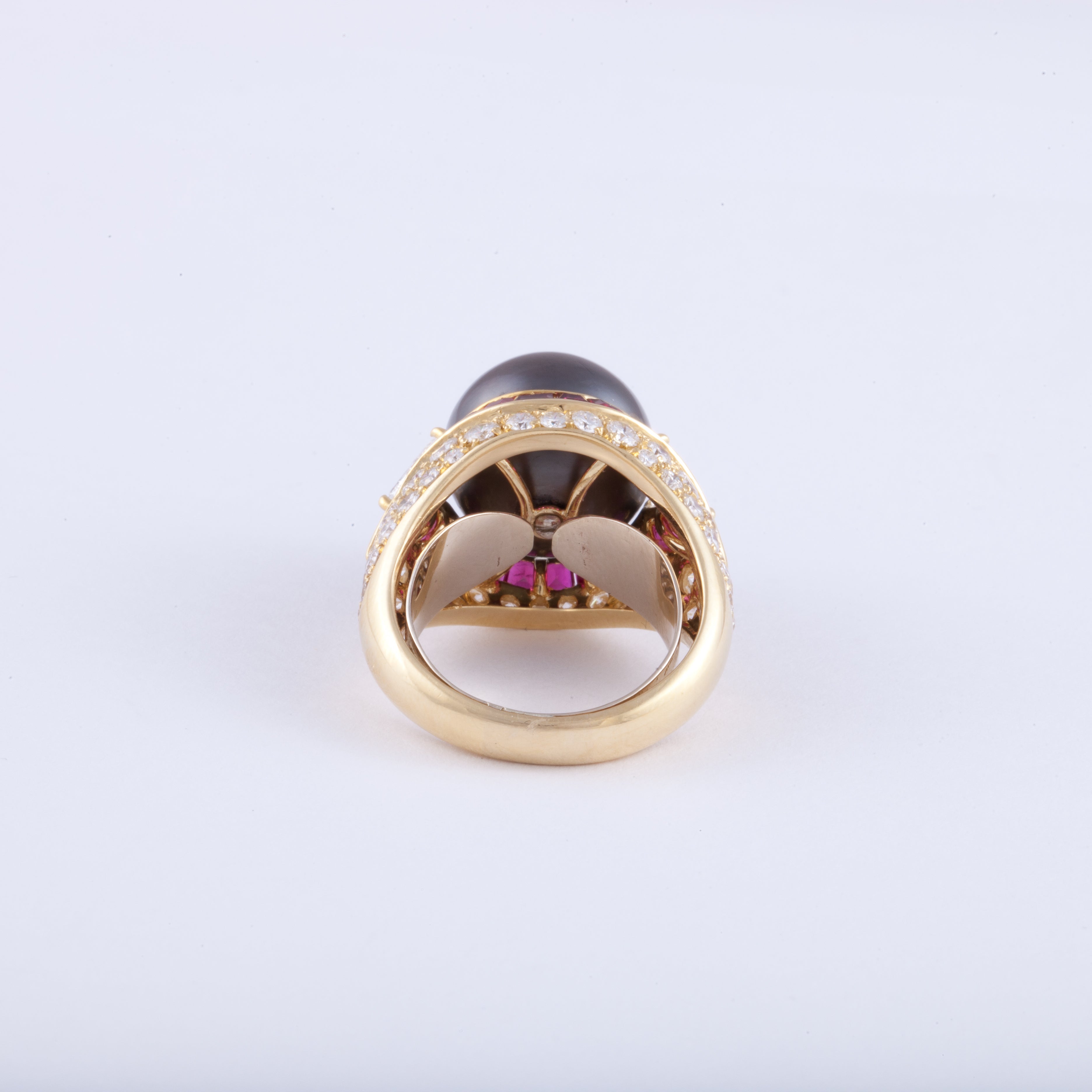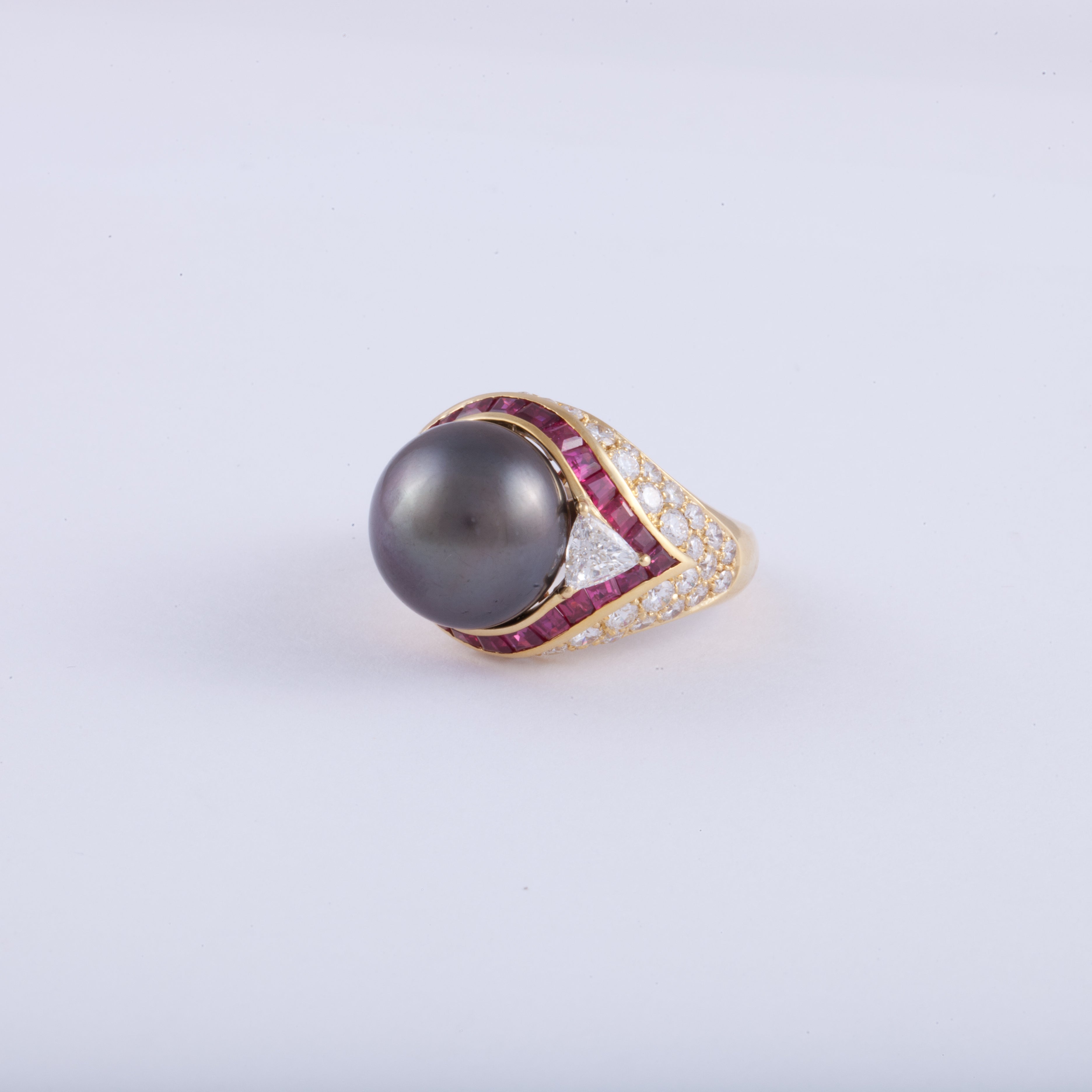 An estate Tahitian pearl, calibre-cut ruby, and diamond cocktail ring, set in 18K yellow gold. Circa 2000.