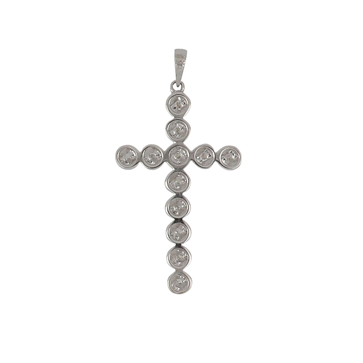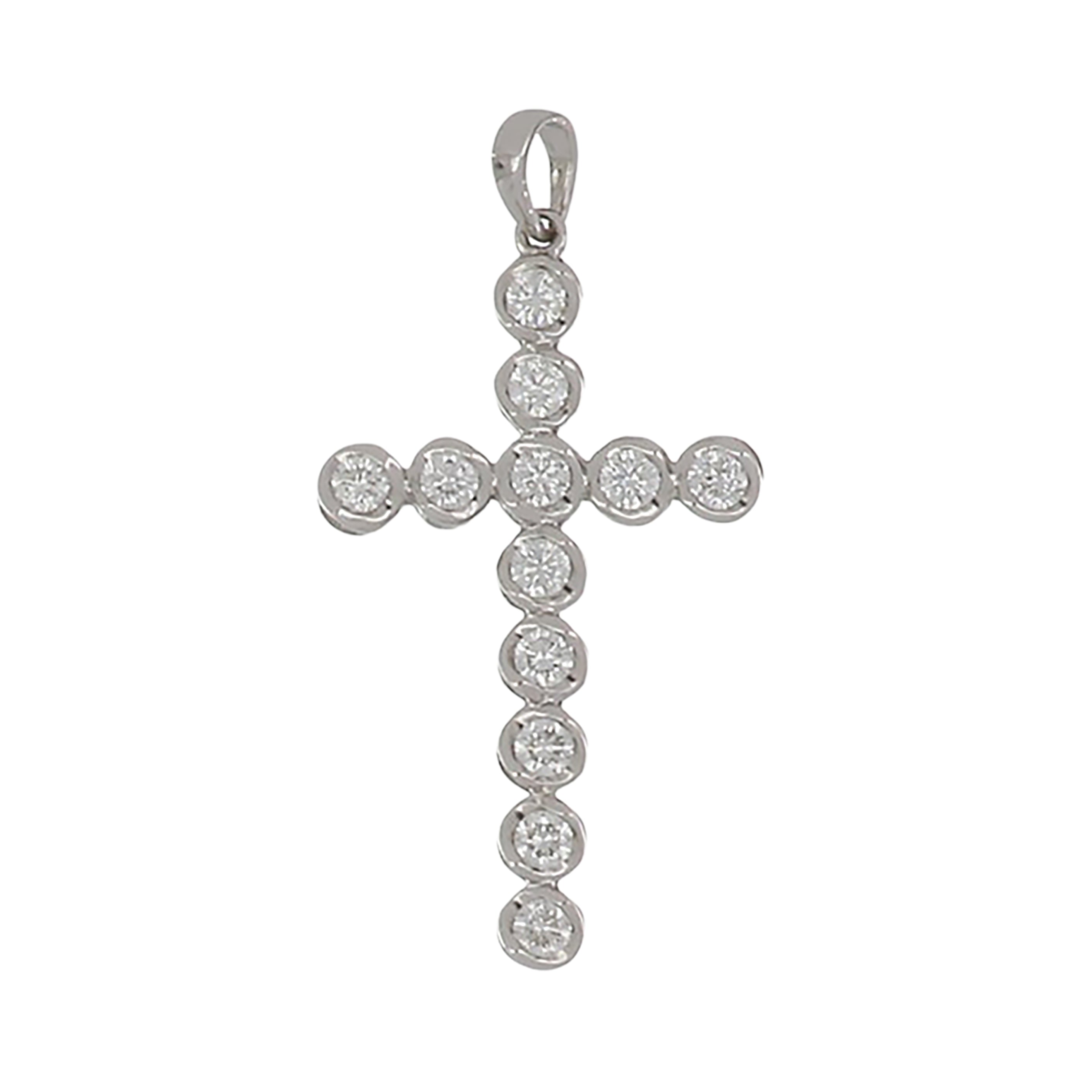 An estate modern, partial bezel-set round brilliant-cut diamond cross pendant set in 18k white gold. Circa 2000.