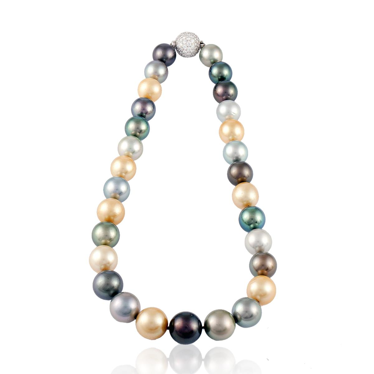 An estate South Sea cultured multi color pearl necklace with an 18K white gold diamond ball clasp.