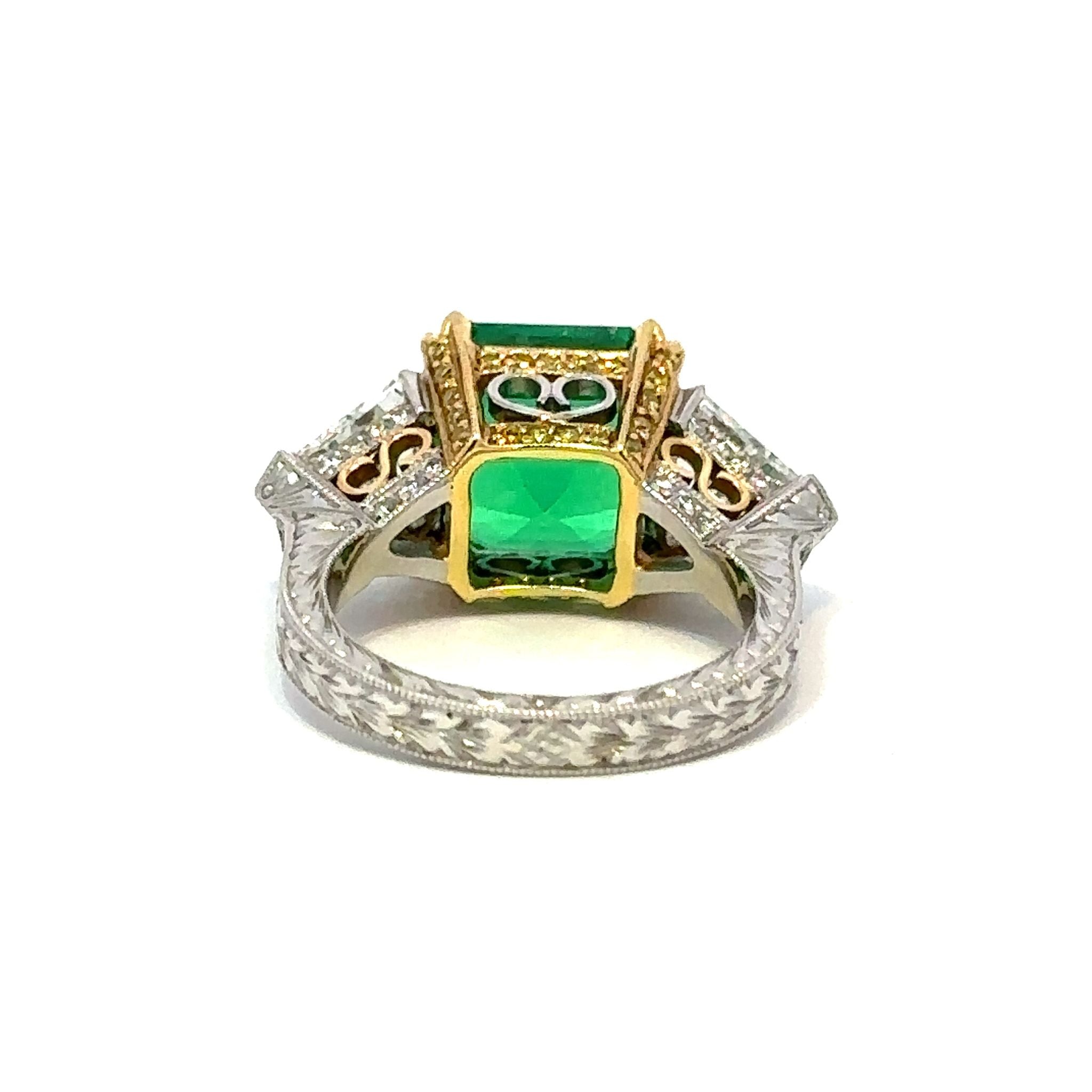 An estate Colombian emerald and trillion cut diamond three stone ring set in platinum and 18k yellow gold.