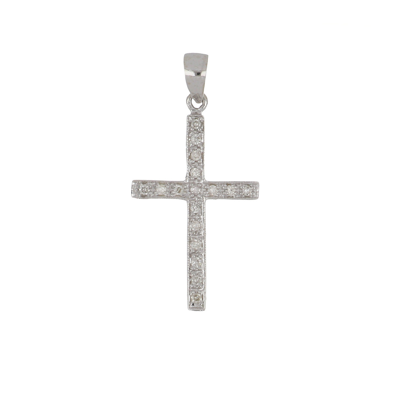 An estate modern, prong-set round diamond cross pendant set in 14k white gold. Circa 2000.