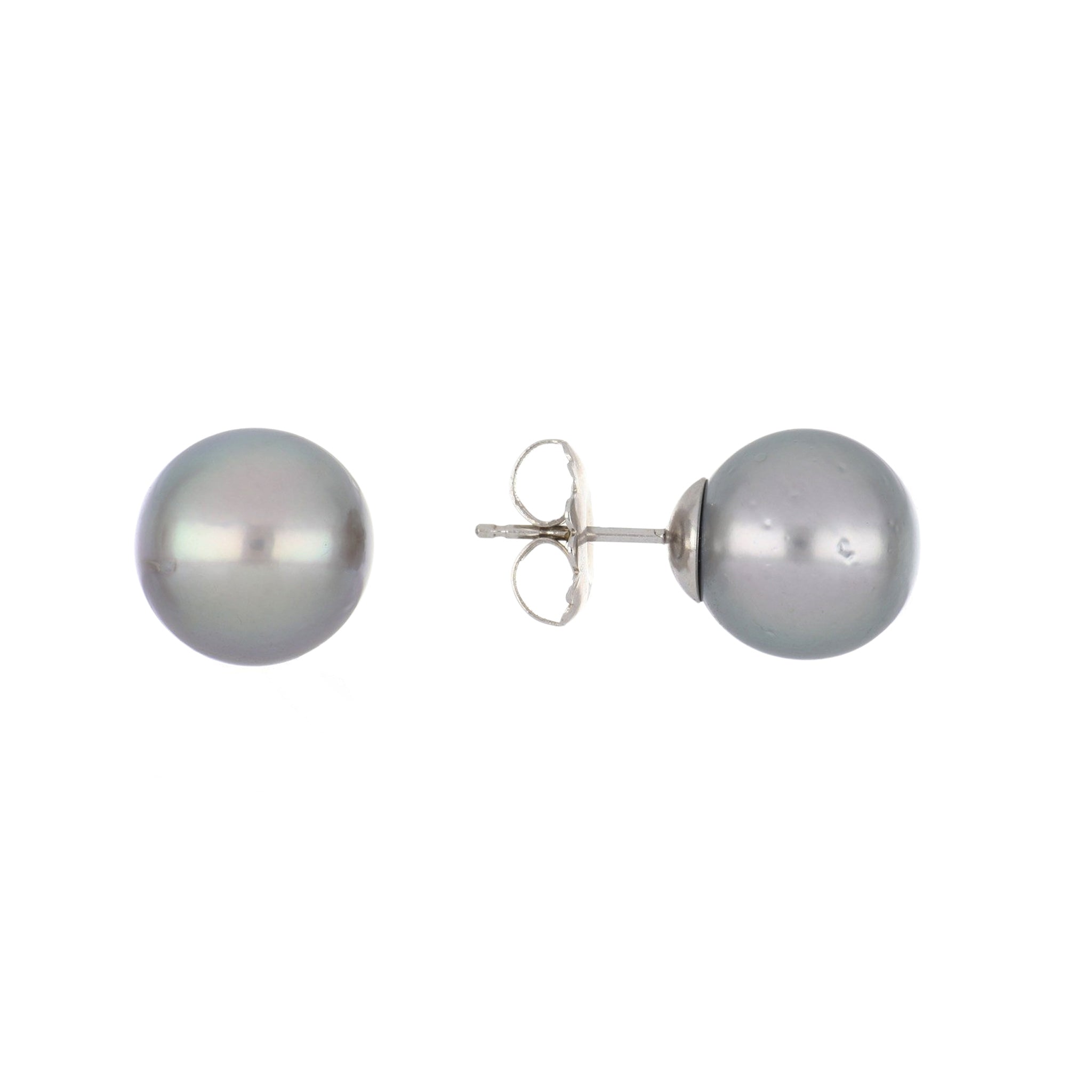 A pair of estate modern, round tahitian pearl stud earrings set in 14k white gold.