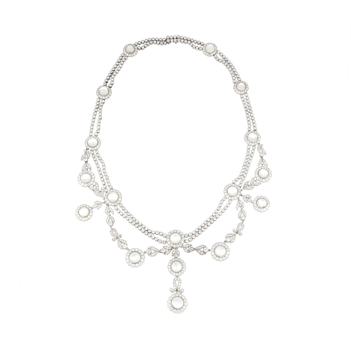 An estate Edwardian-style platinum moonstone and diamond festoon necklace with earrings. Circa 2010. The necklace features doubled strands of collet-set diamonds with moonstone and diamond junctions with a third bead-set diamond strand in a garland design.