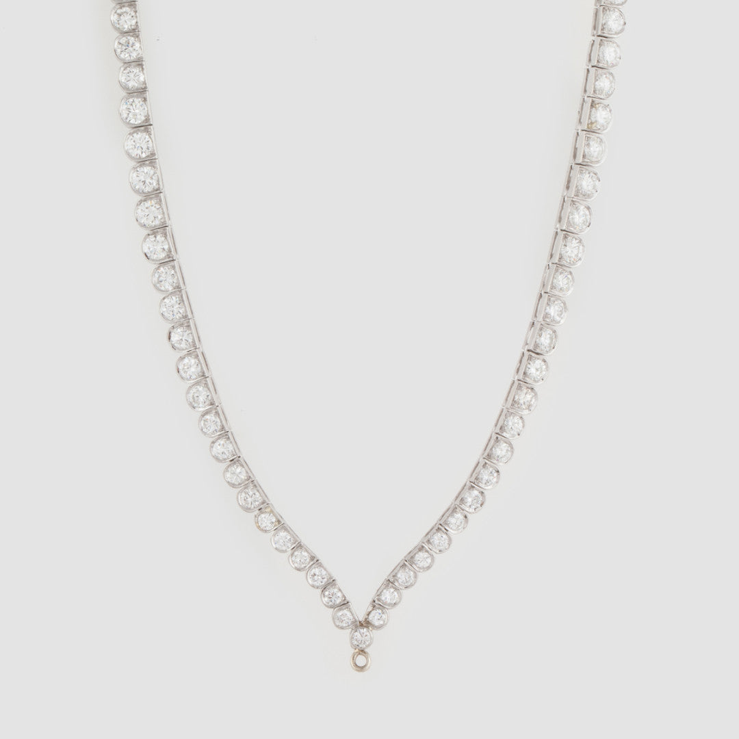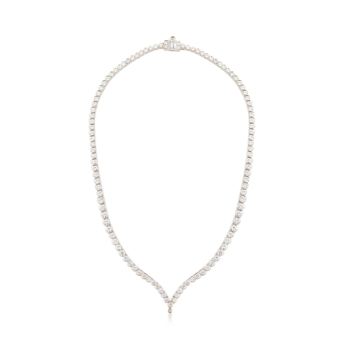 An estate vintage, scalloped round brilliant-cut diamond line necklace in platinum with a decorative clasp set with baguette cut diamonds.