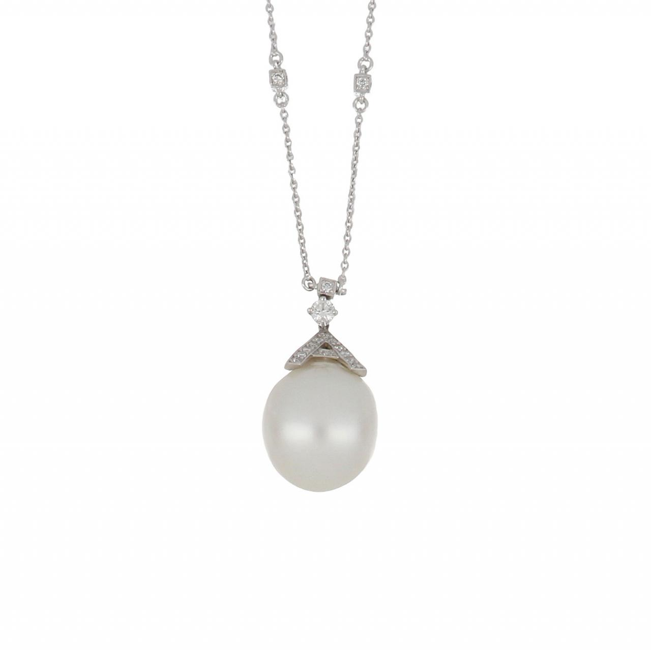 An estate classic modern platinum south sea pearl pendant necklace with diamonds. Circa 2010.