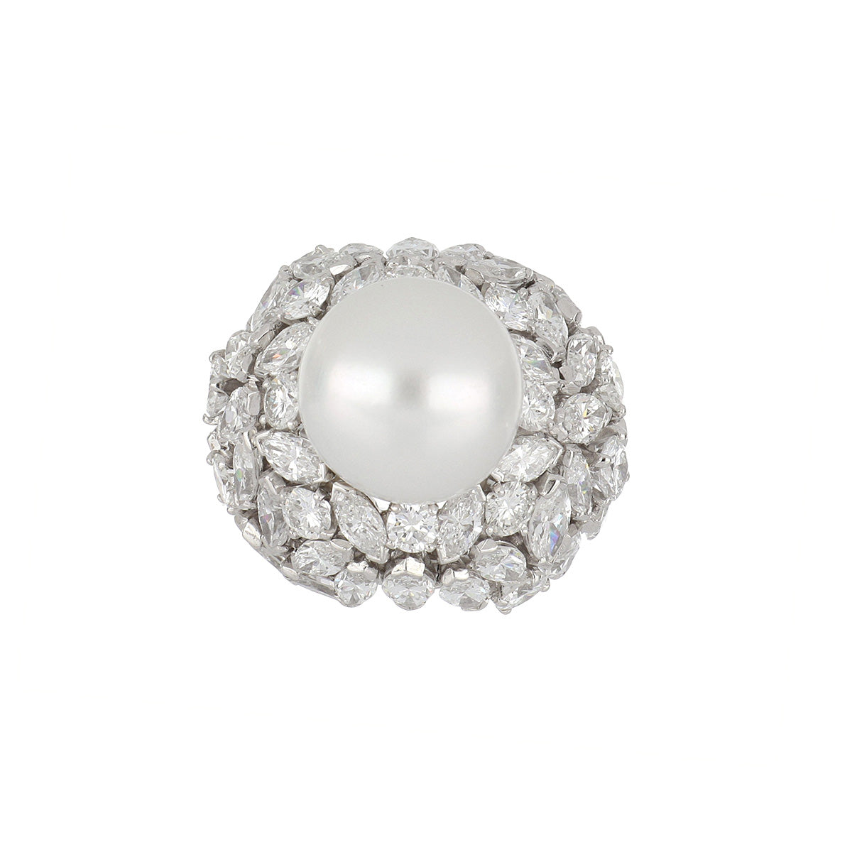 An estate cultured South Sea pearl ring with marquise and round diamonds, set in platinum. Circa 2000.