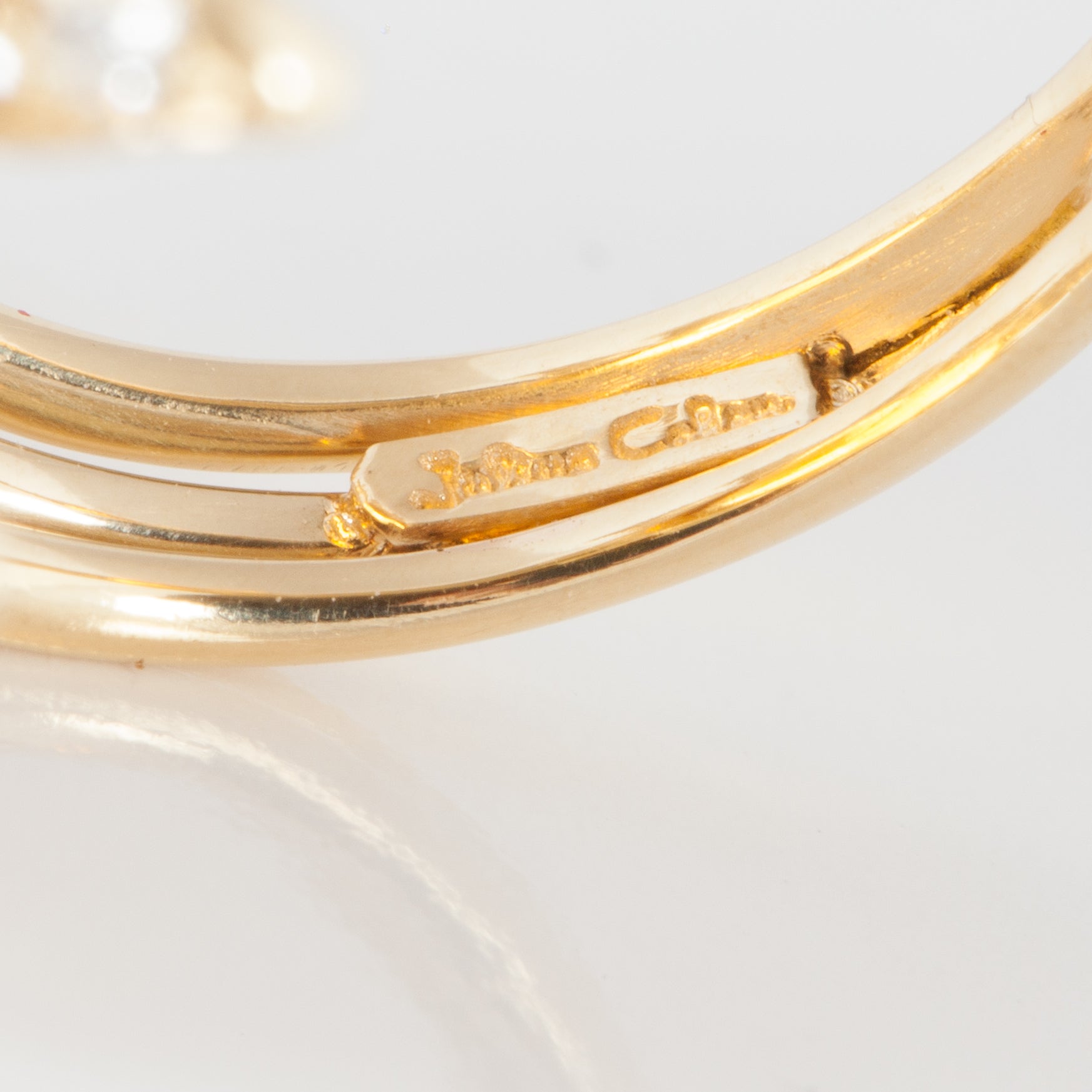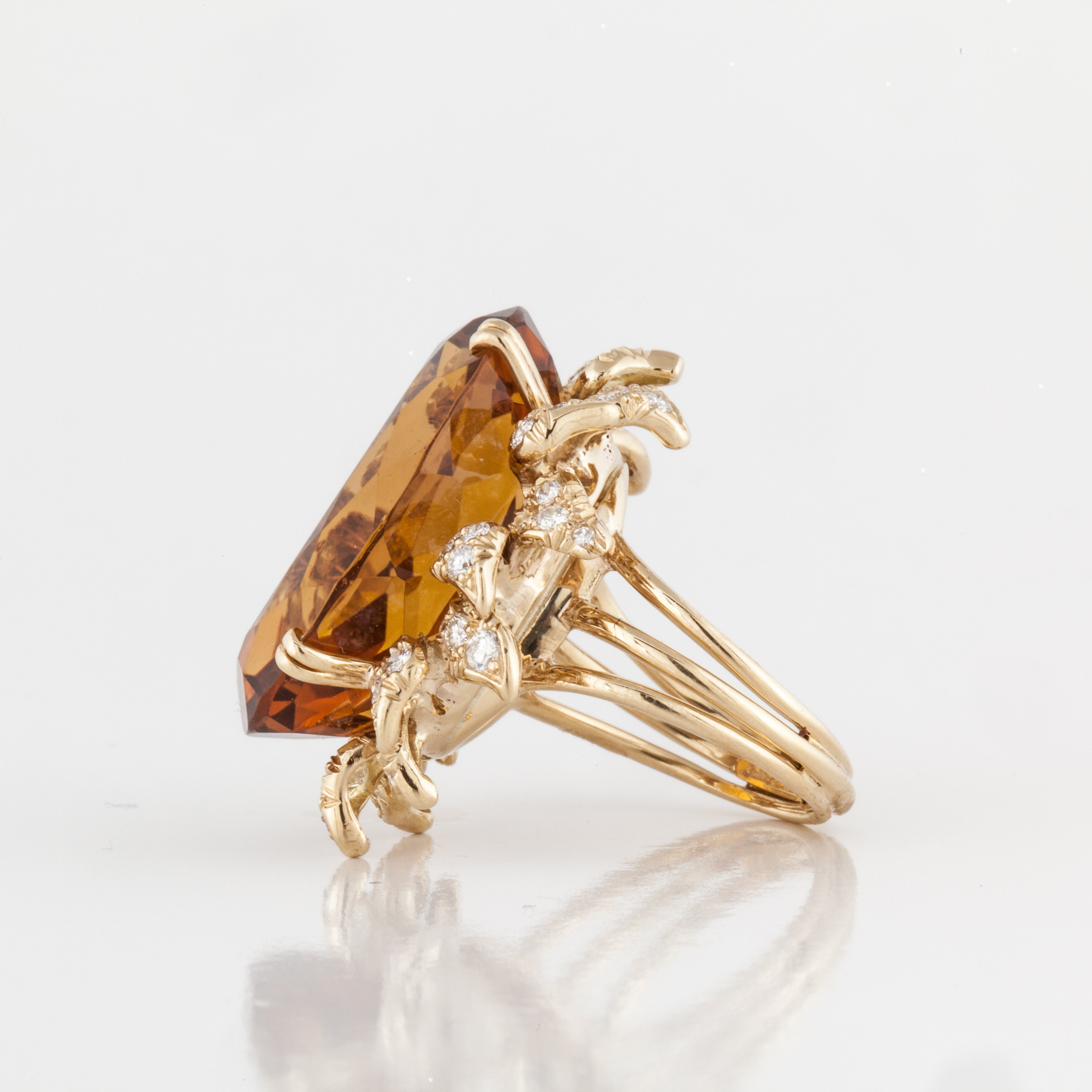 A vintage Julius Cohen oval-cut facted citrine ring with a round-cut diamond petal halo, set in 18K yellow gold. Circa 1970.
