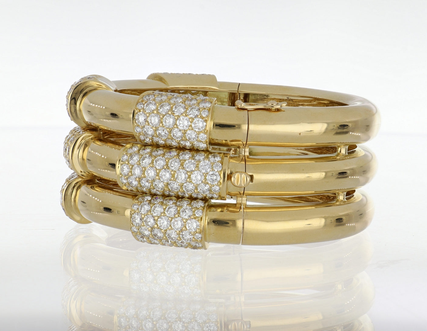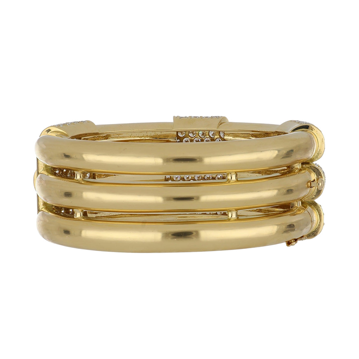 A vintage important Kurt Wayne triple row tube bangle set with pave round brilliant-cut diamonds, in 18K yellow gold. Circa 1990.