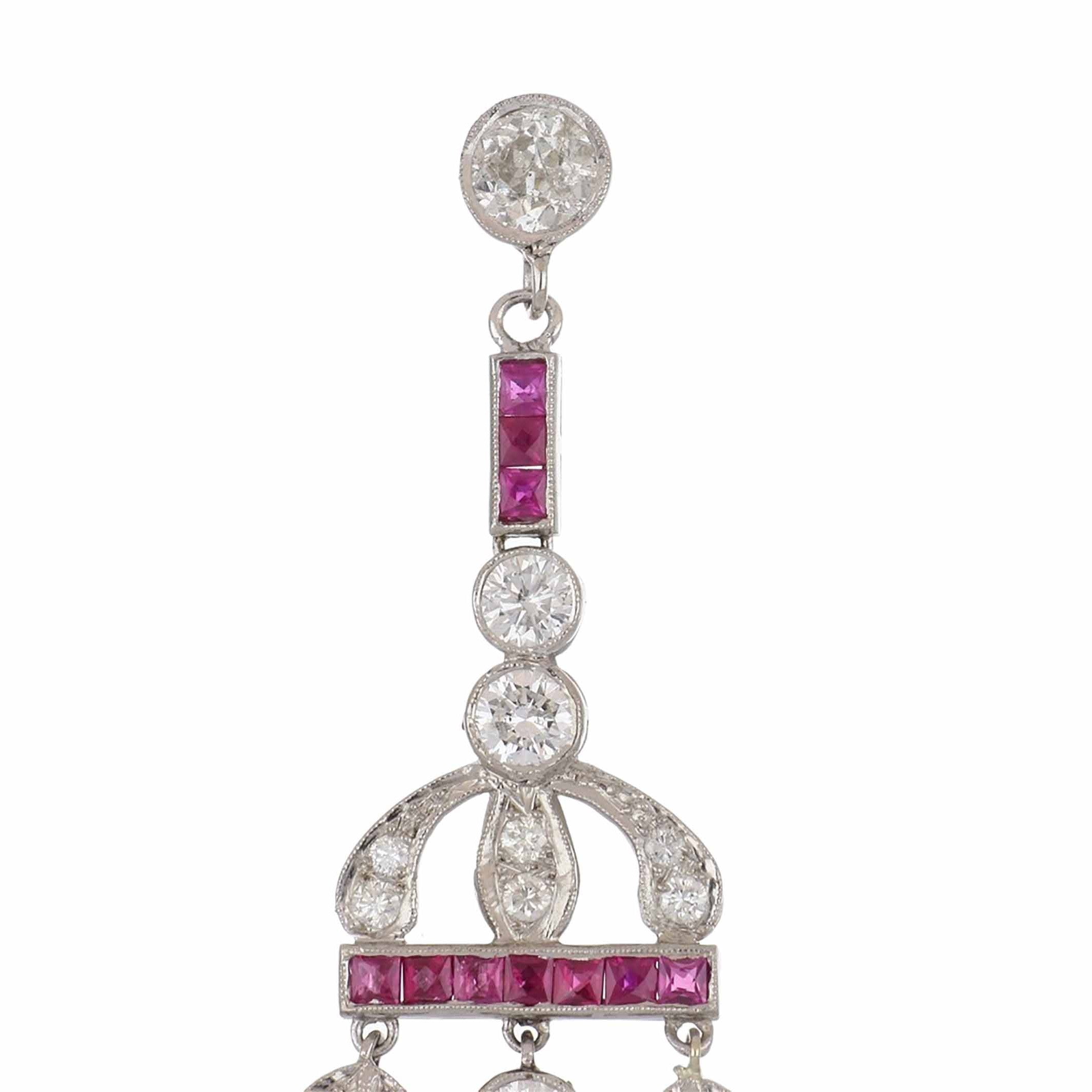 A pair of antique-style bespoke, calibre-cut ruby and round diamond multi-drop earrings set in platinum. Circa 1990