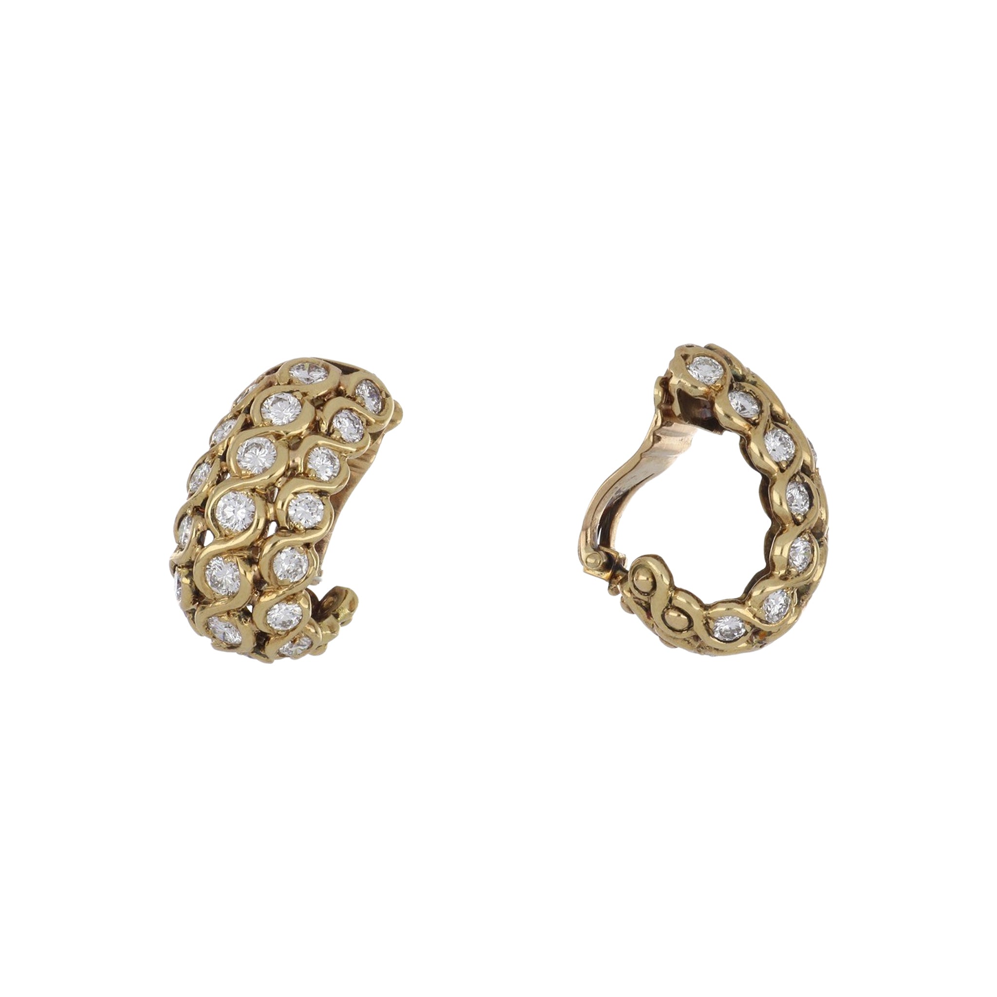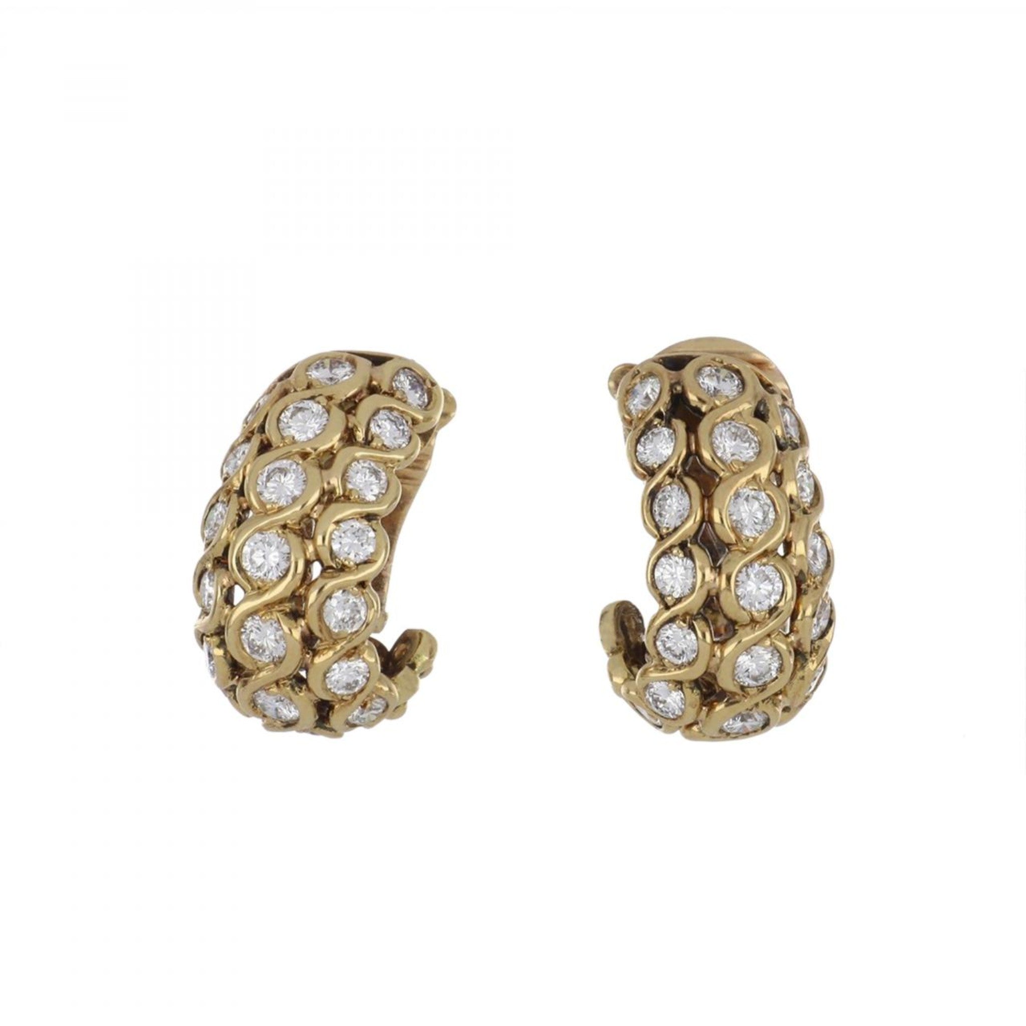 A pair of estate classic vintage Vourakis loop earrings with round diamonds, set in 18K yellow gold.