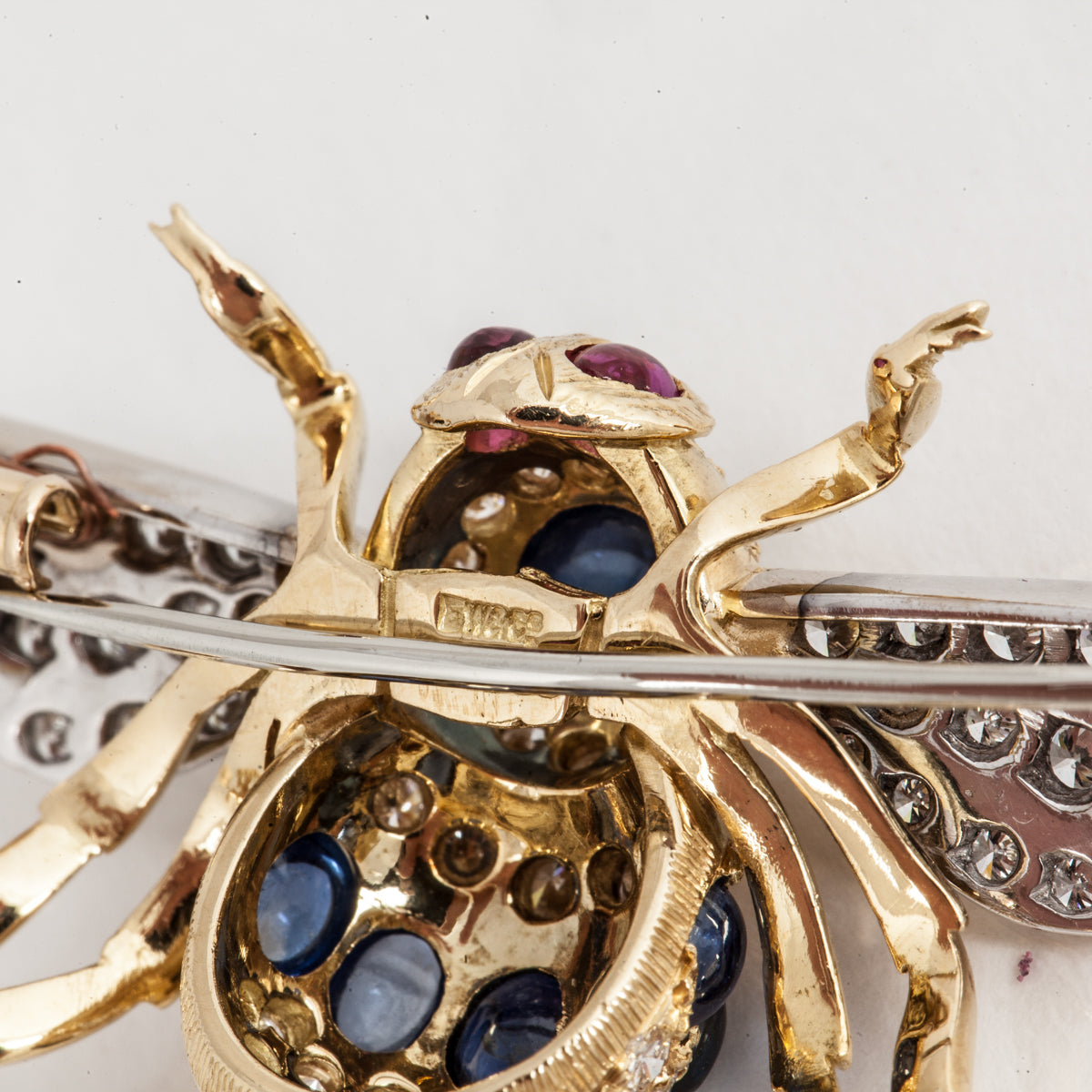 An estate E. Wolfe & Sons bee pin, set with round brilliant-cut diamonds, cabochon-cut sapphires and rubies in 18K yellow and white gold.