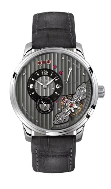 A Glashutte Original PanoInverse watch in stainless steel with an alligator strap.