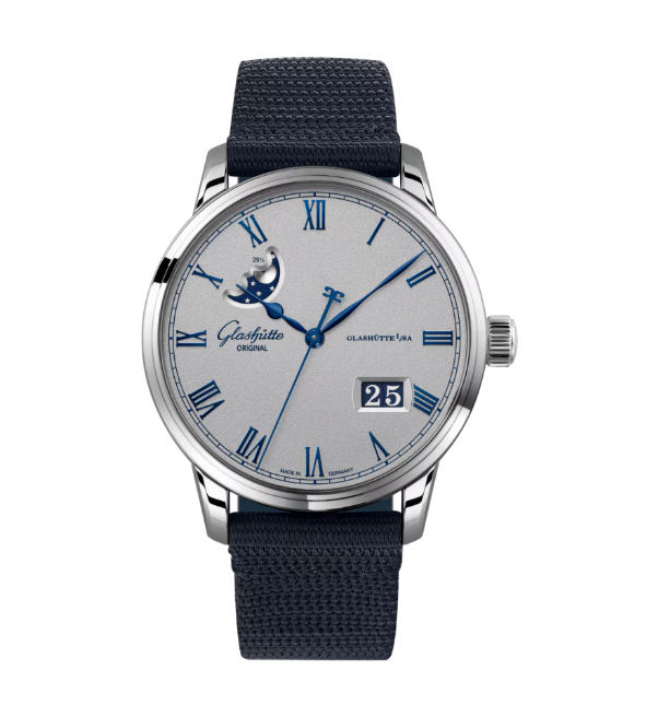 A new Glashutte Original, Senator Excellence Panorama Date Moon Phase in stainless steel and synthetic material.