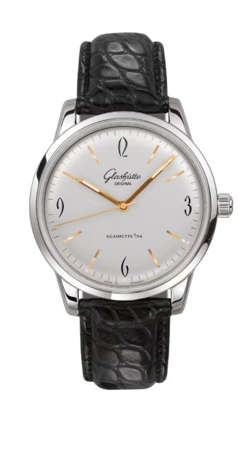 A Glashutte Original Vintage Collection Sixties watch in stainless steel with an alligator strap.