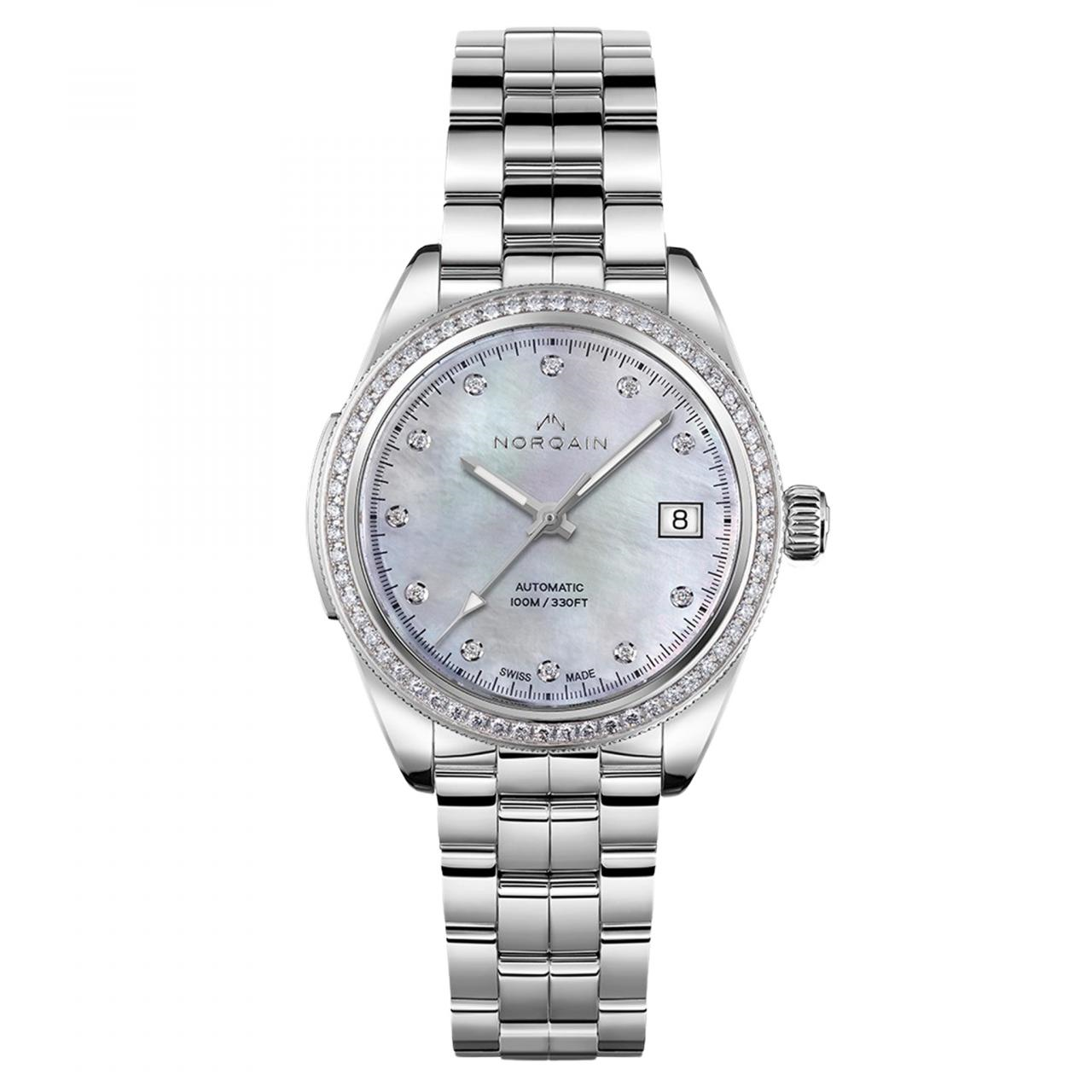 A Norqain stainless steel Adventure Sport 37mm watch with diamond bezel.