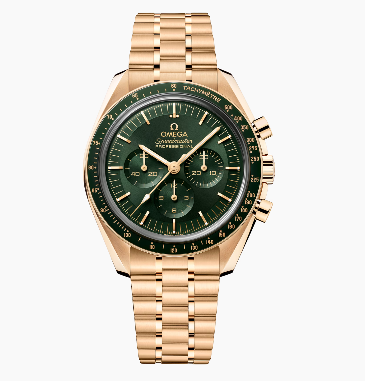 Inspired by the 4th generation Speedmaster, this 42 mm Moonwatch with case and bracelet in 18K Moonshine™ Gold, has a sun-brushed green PVD "step" dial and "Moonwatch" style hands. The green ceramic bezel ring, with OMEGA Ceragold™ tachymeter scale, features the famous dot over 90.The caseback in polished 18K Moonshine™ Gold has double bevels and the words FIRST WATCH WORN ON THE MOON engraved in black.