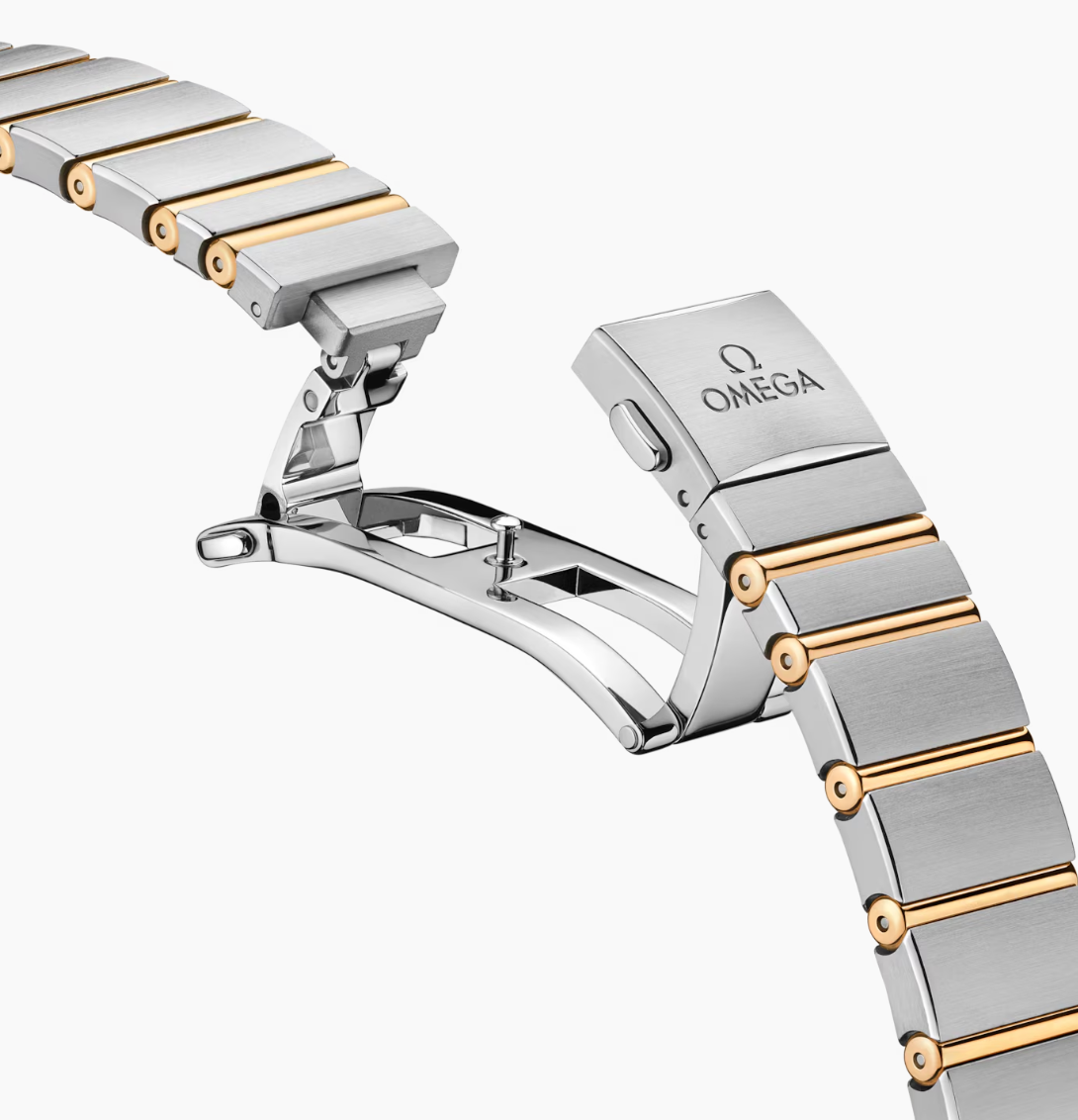 The 28mm watch is presented with a case and mono-rang bracelet created from stainless steel and 18K yellow gold, with signature Constellation features including the polished claws, half-moon facets, and a diamond-paved bezel.