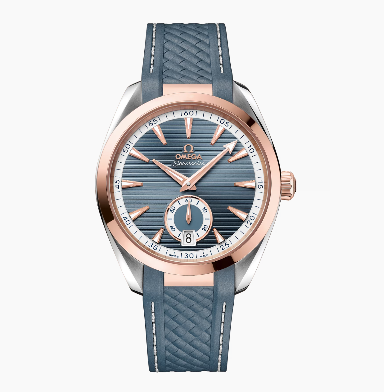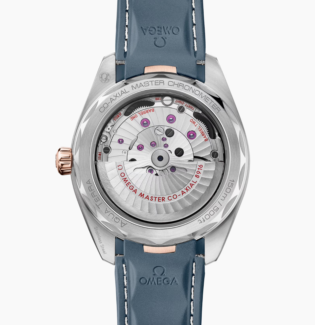 Presented on a structured blue rubber strap with grey stitching, this timepiece is powered by the OMEGA Co-Axial Master Chronometer calibre 8916, certified at the industry’s highest standard by the Swiss Federal Institute of Metrology (METAS).
