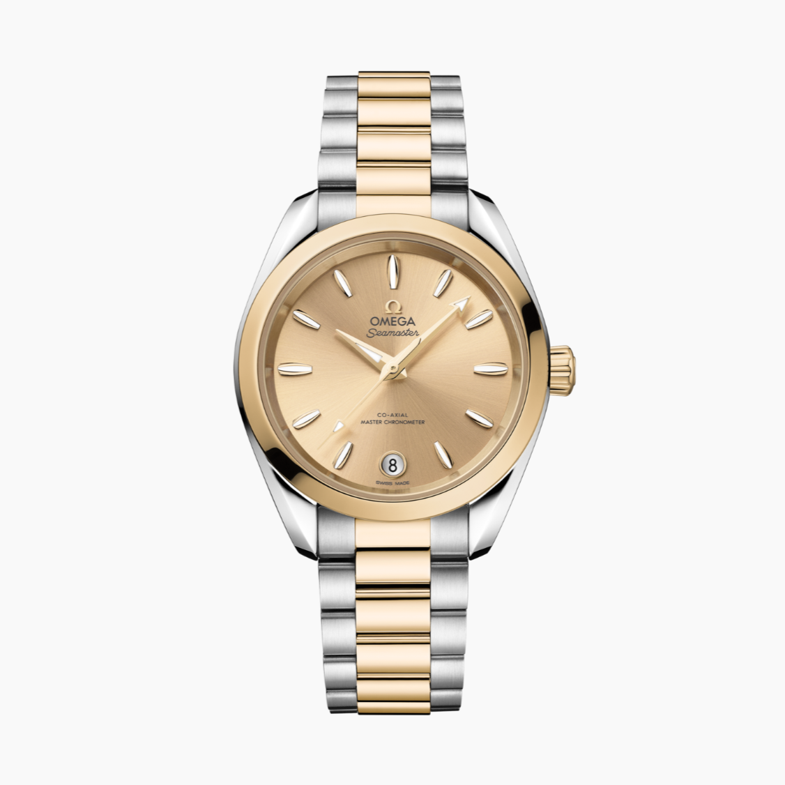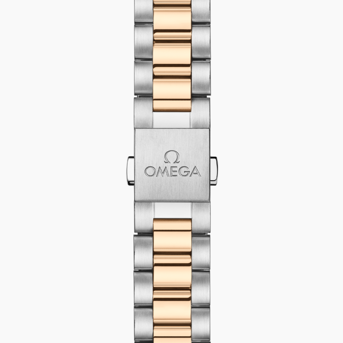 This 34mm model, crafted in polished stainless steel and 18K Moonshine™ Gold, has a conical crown and wave-edged caseback with flat sapphire crystal. The sun-brushed and lacquered PVD-treated Moonshine™ Gold dial features a circular date window at 6 o’clock ringed in 18K Moonshine™ Gold. OMEGA has also used 18K Moonshine™ Gold for the facetted hands and distinctive hour-markers, which are shaped like sailboat hulls and filled with white Super-LumiNova.