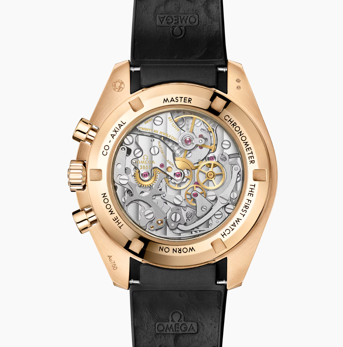 The caseback in polished 18K Moonshine™ Gold has double bevels and the words FIRST WATCH WORN ON THE MOON engraved in black. The Moonwatch is powered by OMEGA's Co-Axial Master Chronometer Calibre 3861 with special luxury finish.