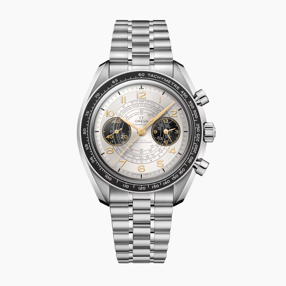 The Chronoscope collection combines the legendary Speedmaster design with OMEGA’s chronograph wristwatches from the 1940s.