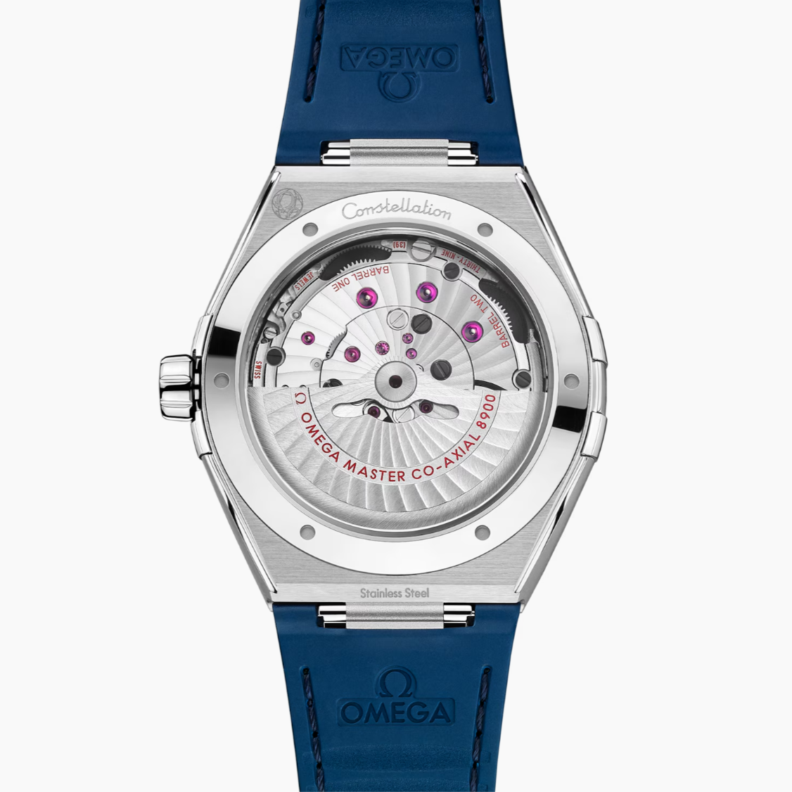 Presented on a blue leather strap with rubber lining, this timepiece is driven by the OMEGA Co-Axial Master Chronometer Calibre 8900, visible through the domed scratch-resistant sapphire crystal.